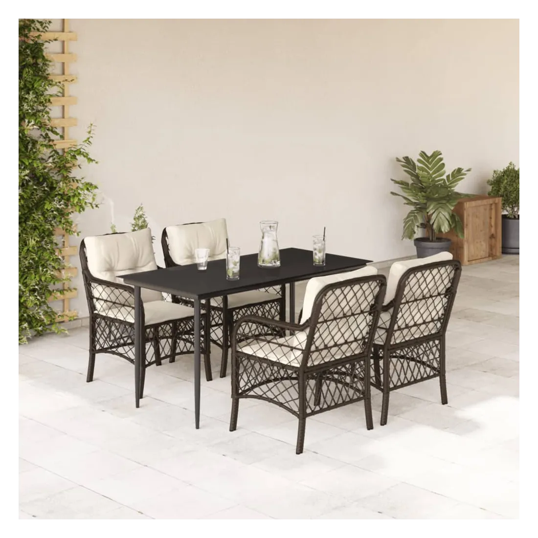Cet ensemble de salle à manger de jardin est un excellent choix pour les repas en plein air ou pour vous détendre dans le jardin, l'arrière-cour ou le patio. Matériau durable : la résine tressée, également connue sous le nom de poly rotin, est un matériau synthétique solide et nécessitant peu d'entretien qui ressemble au rotin naturel. Il est léger, facile à nettoyer et couramment utilisé pour les meubles d'extérieur en raison de sa durabilité et de ses propriétés de résistance aux intempéries.Expérience d'assise confortable : ce mobilier d'extérieur, doté de coussins épais, offre une expérience d'assise confortable.Housse amovible et lavable : ces coussins de siège sont dotés de housses amovibles pour un lavage et un entretien faciles.Dessus en verre : le dessus de la table d'extérieur est fabriqué en verre trempé solide et durable, ce qui le rend facile à nettoyer avec un chiffon humide et ajoute une touche d'élégance à votre espace extérieur.Cadre robuste et stable : le cadre en acier enduit de poudre assure la solidité et la stabilité du meuble de jardin pour une utilisation quotidienne à l'extérieur. Bon à savoir :Pour que vos meubles d'extérieur restent beaux, nous vous recommandons de les protéger avec une housse imperméable.