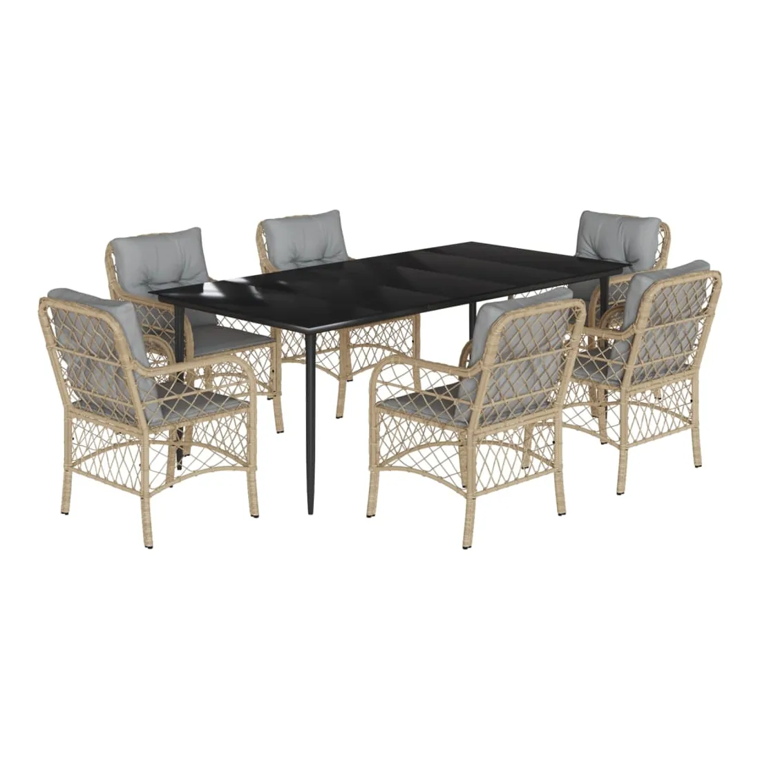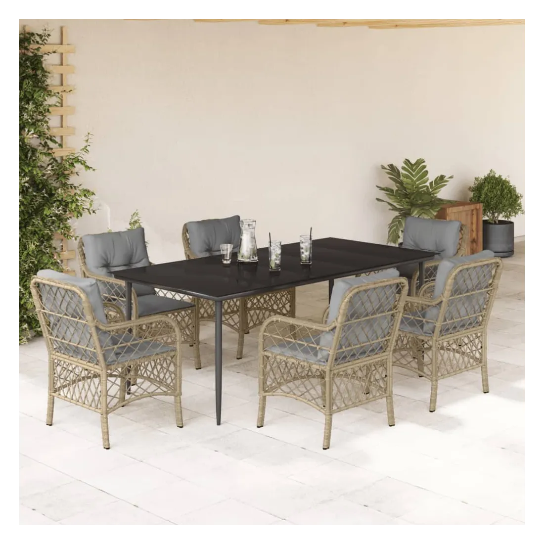 Cet ensemble de salle à manger de jardin est un excellent choix pour les repas en plein air ou pour vous détendre dans le jardin, l'arrière-cour ou le patio. Matériau durable : la résine tressée, également connue sous le nom de poly rotin, est un matériau synthétique solide et nécessitant peu d'entretien qui ressemble au rotin naturel. Il est léger, facile à nettoyer et couramment utilisé pour les meubles d'extérieur en raison de sa durabilité et de ses propriétés de résistance aux intempéries.Expérience d'assise confortable : ce mobilier d'extérieur, doté de coussins épais, offre une expérience d'assise confortable.Housse amovible et lavable : ces coussins de siège sont dotés de housses amovibles pour un lavage et un entretien faciles.Dessus en verre : le dessus de la table d'extérieur est fabriqué en verre trempé solide et durable, ce qui le rend facile à nettoyer avec un chiffon humide et ajoute une touche d'élégance à votre espace extérieur.Cadre robuste et stable : le cadre en acier enduit de poudre assure la solidité et la stabilité du meuble de jardin pour une utilisation quotidienne à l'extérieur. Bon à savoir :Pour que vos meubles d'extérieur restent beaux, nous vous recommandons de les protéger avec une housse imperméable.