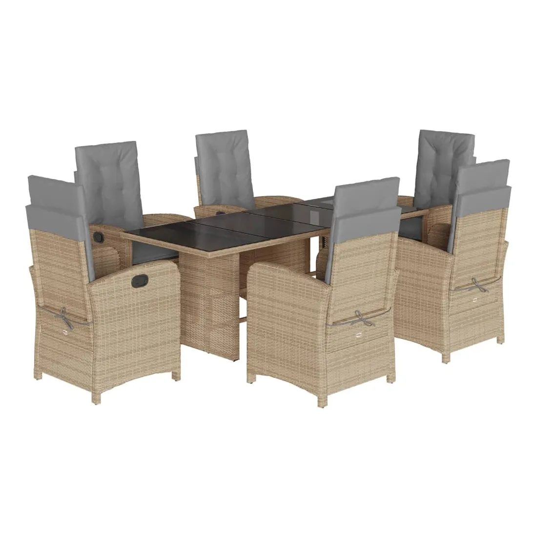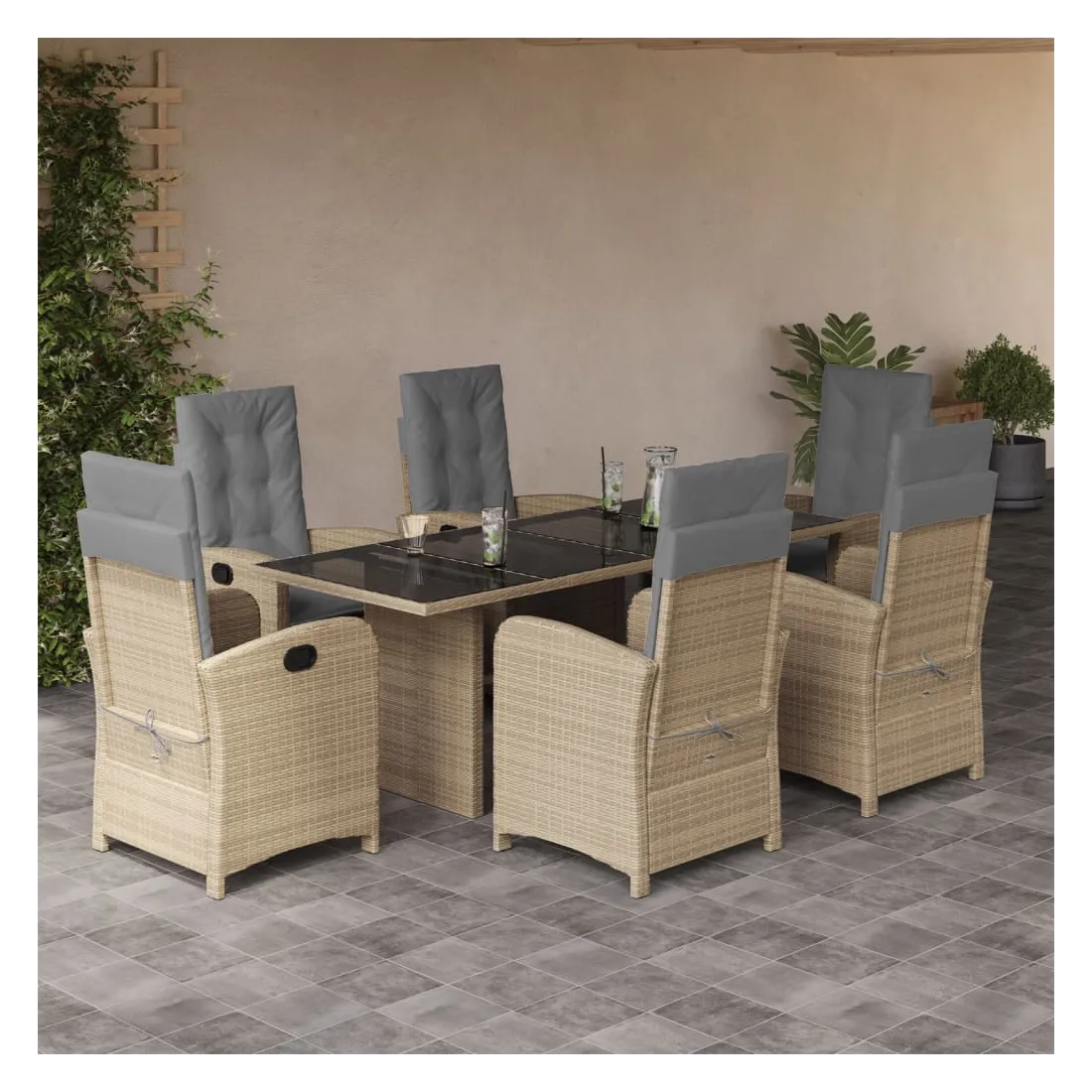Cet ensemble de salle à manger de jardin est un excellent choix pour les repas en plein air ou pour vous détendre dans le jardin, dans l'arrière-cour ou sur la terrasse. Matériau durable : la résine tressée, également connue sous le nom de poly rotin, est un matériau synthétique solide et nécessitant peu d'entretien qui ressemble au rotin naturel. Il est léger, facile à nettoyer et couramment utilisé pour les meubles d'extérieur en raison de sa durabilité et de ses propriétés de résistance aux intempéries.Dossier réglable : ce siège de jardin est doté d'une poignée. Vous pouvez régler le dossier dans n'importe quelle position en tirant sur la poignée et le remettre rapidement dans sa position initiale.Expérience d'assise confortable : ce mobilier d'extérieur, doté de coussins épais, offre une expérience d'assise confortable.Housse amovible et lavable : ces coussins de siège sont dotés de housses amovibles pour un lavage et un entretien faciles. Les coussins de dossier ont un rabat à l'arrière pour une fixation facile aux dossiers.Dessus en verre : le dessus de la table d'extérieur est fabriqué en verre trempé solide et durable, ce qui le rend facile à nettoyer avec un chiffon humide et ajoute une touche d'élégance à votre espace extérieur. Bon à savoir :Pour que vos meubles d'extérieur restent beaux, nous vous recommandons de les protéger avec une housse imperméable.