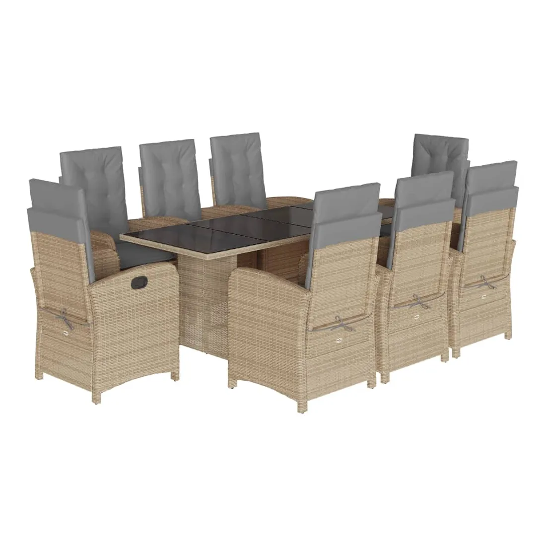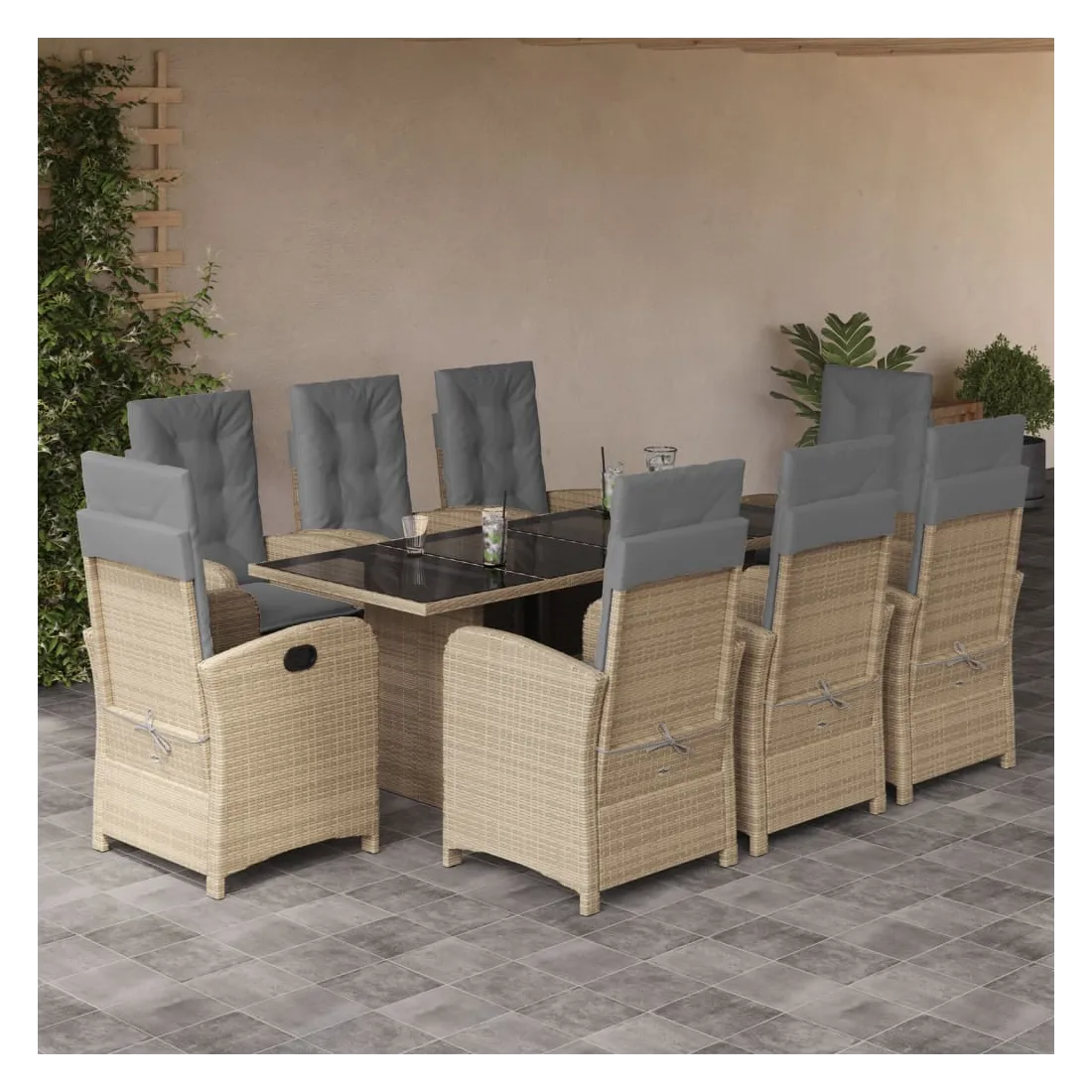Cet ensemble de salle à manger de jardin est un excellent choix pour les repas en plein air ou pour vous détendre dans le jardin, dans l'arrière-cour ou sur la terrasse. Matériau durable : la résine tressée, également connue sous le nom de poly rotin, est un matériau synthétique solide et nécessitant peu d'entretien qui ressemble au rotin naturel. Il est léger, facile à nettoyer et couramment utilisé pour les meubles d'extérieur en raison de sa durabilité et de ses propriétés de résistance aux intempéries.Dossier réglable : ce siège de jardin est doté d'une poignée. Vous pouvez régler le dossier dans n'importe quelle position en tirant sur la poignée et le remettre rapidement dans sa position initiale.Expérience d'assise confortable : ce mobilier d'extérieur, doté de coussins épais, offre une expérience d'assise confortable.Housse amovible et lavable : ces coussins de siège sont dotés de housses amovibles pour un lavage et un entretien faciles. Les coussins de dossier ont un rabat à l'arrière pour une fixation facile aux dossiers.Dessus en verre : le dessus de la table d'extérieur est fabriqué en verre trempé solide et durable, ce qui le rend facile à nettoyer avec un chiffon humide et ajoute une touche d'élégance à votre espace extérieur. Bon à savoir :Pour que vos meubles d'extérieur restent beaux, nous vous recommandons de les protéger avec une housse imperméable.