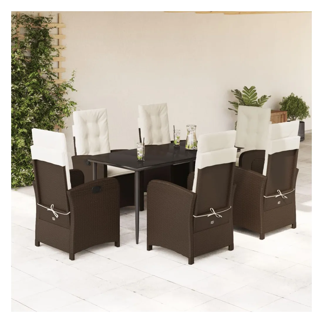 Cet ensemble de salle à manger de jardin est un excellent choix pour les repas en plein air ou pour vous détendre dans le jardin, dans l'arrière-cour ou sur la terrasse. Matériau durable : la résine tressée, également connue sous le nom de poly rotin, est un matériau synthétique solide et nécessitant peu d'entretien qui ressemble au rotin naturel. Il est léger, facile à nettoyer et couramment utilisé pour les meubles d'extérieur en raison de sa durabilité et de ses propriétés de résistance aux intempéries.Dossier réglable : ce siège de jardin est doté d'une poignée. Vous pouvez régler le dossier dans n'importe quelle position en tirant sur la poignée et le remettre rapidement dans sa position initiale.Expérience d'assise confortable : ce mobilier d'extérieur, doté de coussins épais, offre une expérience d'assise confortable.Housse amovible et lavable : ces coussins de siège sont dotés de housses amovibles pour un lavage et un entretien faciles. Les coussins de dossier ont un rabat à l'arrière pour une fixation facile aux dossiers.Dessus en verre : le dessus de la table d'extérieur est fabriqué en verre trempé solide et durable, ce qui le rend facile à nettoyer avec un chiffon humide et ajoute une touche d'élégance à votre espace extérieur. Bon à savoir :Pour que vos meubles d'extérieur restent beaux, nous vous recommandons de les protéger avec une housse imperméable.