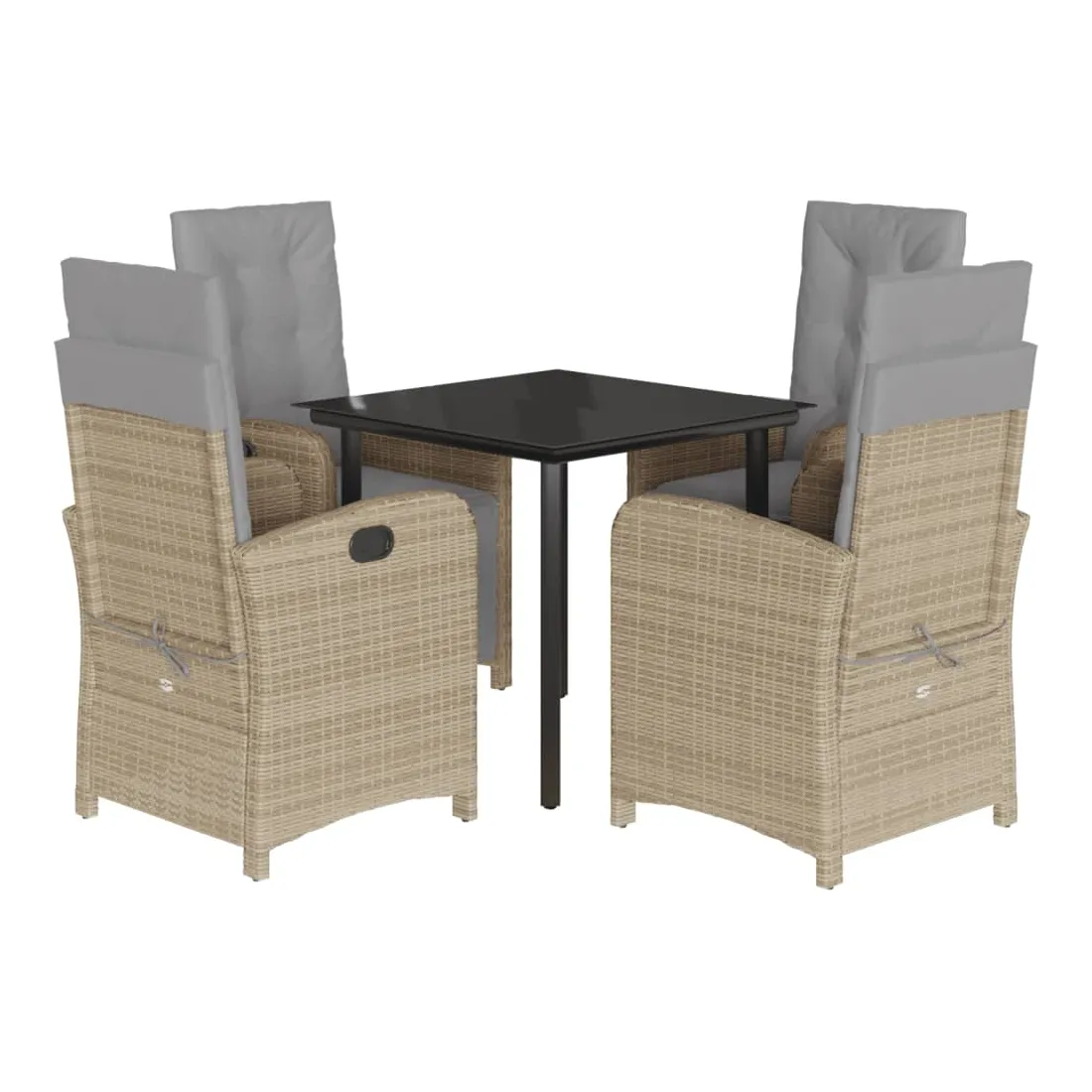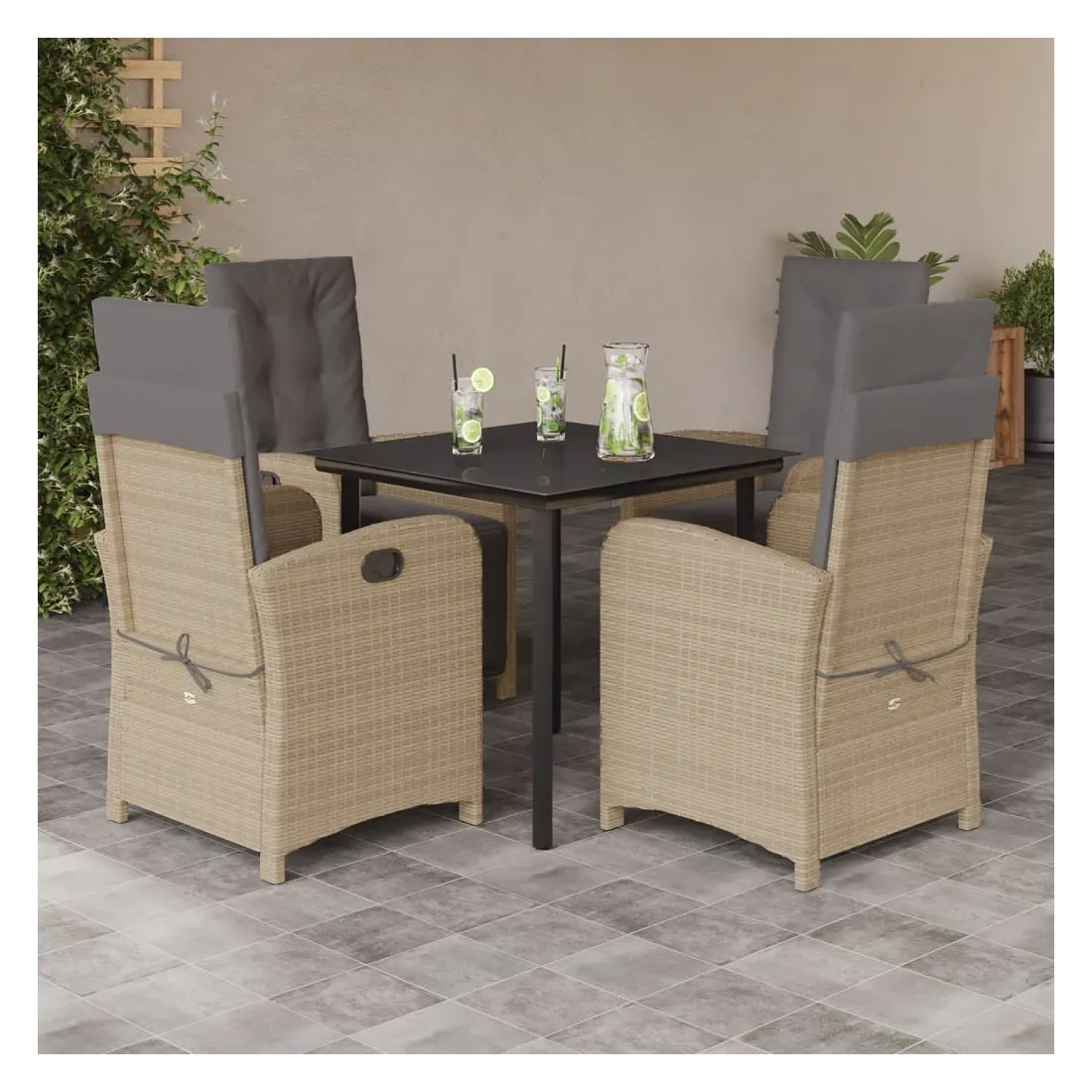 Cet ensemble de salle à manger de jardin est un excellent choix pour les repas en plein air ou pour vous détendre dans le jardin, dans l'arrière-cour ou sur la terrasse. Matériau durable : la résine tressée, également connue sous le nom de poly rotin, est un matériau synthétique solide et nécessitant peu d'entretien qui ressemble au rotin naturel. Il est léger, facile à nettoyer et couramment utilisé pour les meubles d'extérieur en raison de sa durabilité et de ses propriétés de résistance aux intempéries.Dossier réglable : ce siège de jardin est doté d'une poignée. Vous pouvez régler le dossier dans n'importe quelle position en tirant sur la poignée et le remettre rapidement dans sa position initiale.Expérience d'assise confortable : ce mobilier d'extérieur, doté de coussins épais, offre une expérience d'assise confortable.Housse amovible et lavable : ces coussins de siège sont dotés de housses amovibles pour un lavage et un entretien faciles. Les coussins de dossier ont un rabat à l'arrière pour une fixation facile aux dossiers.Dessus en verre : le dessus de la table d'extérieur est fabriqué en verre trempé solide et durable, ce qui le rend facile à nettoyer avec un chiffon humide et ajoute une touche d'élégance à votre espace extérieur. Bon à savoir :Pour que vos meubles d'extérieur restent beaux, nous vous recommandons de les protéger avec une housse imperméable.