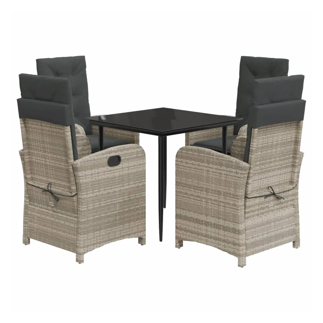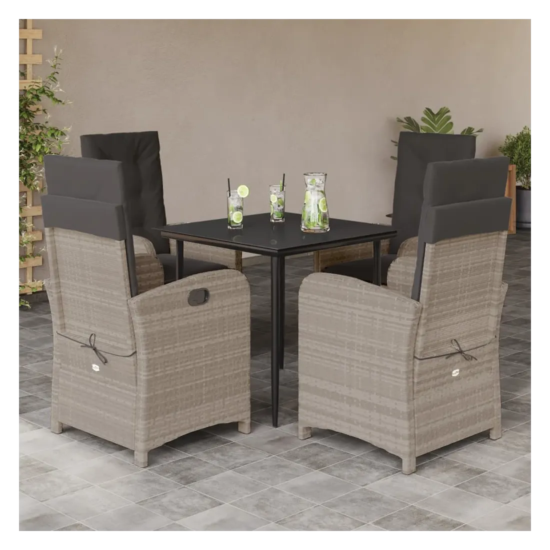 Cet ensemble de salle à manger de jardin est un excellent choix pour les repas en plein air ou pour vous détendre dans le jardin, dans l'arrière-cour ou sur la terrasse. Matériau durable : la résine tressée, également connue sous le nom de poly rotin, est un matériau synthétique solide et nécessitant peu d'entretien qui ressemble au rotin naturel. Il est léger, facile à nettoyer et couramment utilisé pour les meubles d'extérieur en raison de sa durabilité et de ses propriétés de résistance aux intempéries.Dossier réglable : ce siège de jardin est doté d'une poignée. Vous pouvez régler le dossier dans n'importe quelle position en tirant sur la poignée et le remettre rapidement dans sa position initiale.Expérience d'assise confortable : ce mobilier d'extérieur, doté de coussins épais, offre une expérience d'assise confortable.Housse amovible et lavable : ces coussins de siège sont dotés de housses amovibles pour un lavage et un entretien faciles. Les coussins de dossier ont un rabat à l'arrière pour une fixation facile aux dossiers.Dessus en verre : le dessus de la table d'extérieur est fabriqué en verre trempé solide et durable, ce qui le rend facile à nettoyer avec un chiffon humide et ajoute une touche d'élégance à votre espace extérieur. Bon à savoir :Pour que vos meubles d'extérieur restent beaux, nous vous recommandons de les protéger avec une housse imperméable.