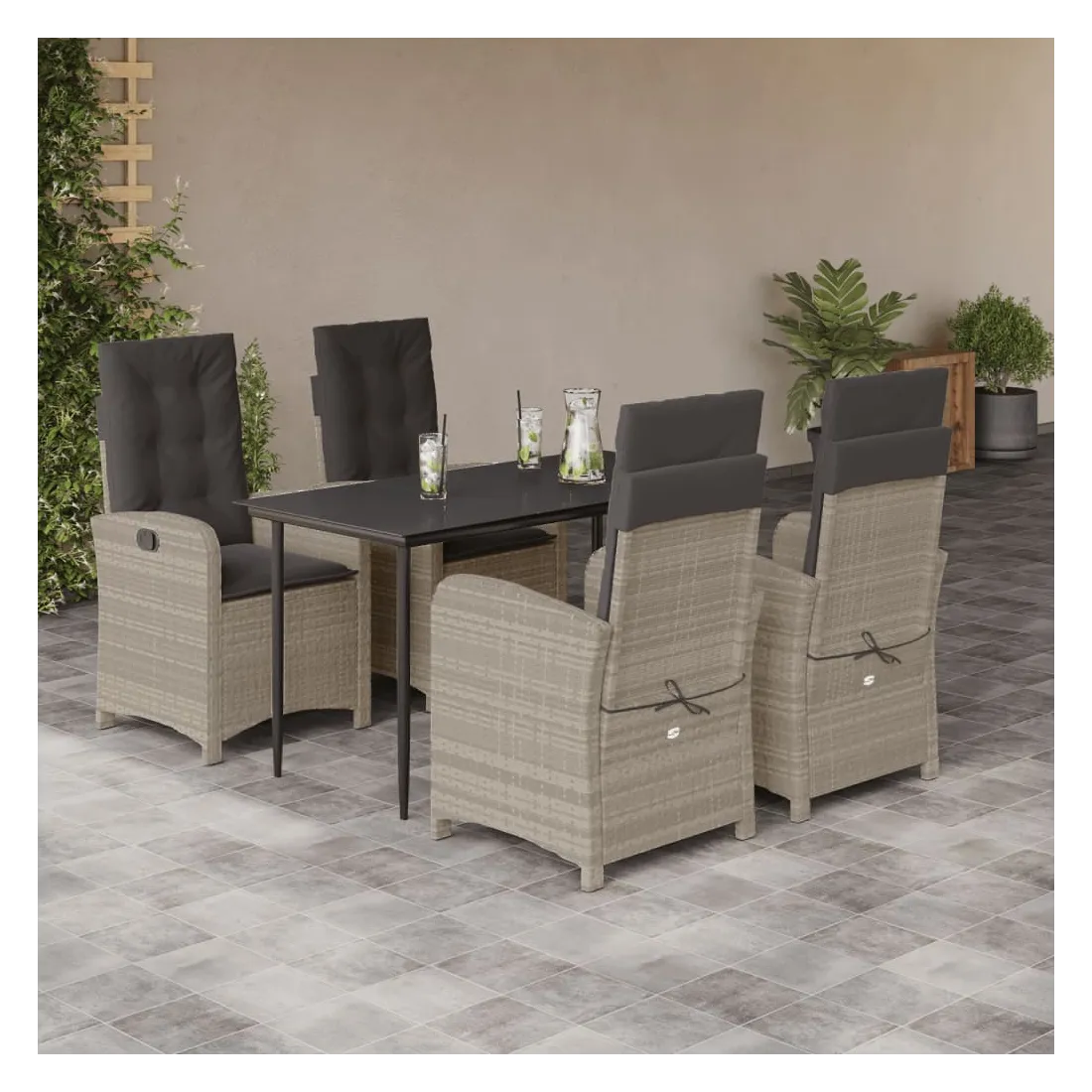 Cet ensemble de salle à manger de jardin est un excellent choix pour les repas en plein air ou pour vous détendre dans le jardin, dans l'arrière-cour ou sur la terrasse. Matériau durable : la résine tressée, également connue sous le nom de poly rotin, est un matériau synthétique solide et nécessitant peu d'entretien qui ressemble au rotin naturel. Il est léger, facile à nettoyer et couramment utilisé pour les meubles d'extérieur en raison de sa durabilité et de ses propriétés de résistance aux intempéries.Dossier réglable : ce siège de jardin est doté d'une poignée. Vous pouvez régler le dossier dans n'importe quelle position en tirant sur la poignée et le remettre rapidement dans sa position initiale.Expérience d'assise confortable : ce mobilier d'extérieur, doté de coussins épais, offre une expérience d'assise confortable.Housse amovible et lavable : ces coussins de siège sont dotés de housses amovibles pour un lavage et un entretien faciles. Les coussins de dossier ont un rabat à l'arrière pour une fixation facile aux dossiers.Dessus en verre : le dessus de la table d'extérieur est fabriqué en verre trempé solide et durable, ce qui le rend facile à nettoyer avec un chiffon humide et ajoute une touche d'élégance à votre espace extérieur. Bon à savoir :Pour que vos meubles d'extérieur restent beaux, nous vous recommandons de les protéger avec une housse imperméable.