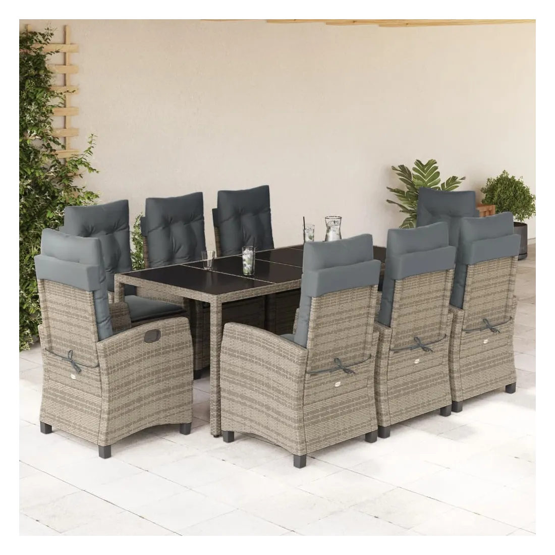 Cet ensemble de salle à manger de jardin est un excellent choix pour les repas en plein air ou pour vous détendre dans le jardin, l'arrière-cour ou le patio. Matériau durable : la résine tressée, également connue sous le nom de poly rotin, est un matériau synthétique solide et nécessitant peu d'entretien qui ressemble au rotin naturel. Il est léger, facile à nettoyer et couramment utilisé pour les meubles d'extérieur en raison de sa durabilité et de ses propriétés de résistance aux intempéries. Dossier réglable : ce siège de jardin est doté d'une poignée. Vous pouvez régler le dossier dans n'importe quelle position en tirant sur la poignée et le remettre rapidement dans sa position initiale.Dessus en verre : le dessus de la table d'extérieur est fabriqué en verre trempé solide et durable, ce qui le rend facile à nettoyer avec un chiffon humide et ajoute une touche d'élégance à votre espace extérieur. Expérience d'assise confortable : ce mobilier d'extérieur, doté de coussins épais, offre une expérience d'assise confortable. Housse amovible et lavable : ces coussins de siège sont dotés de housses amovibles pour un lavage et un entretien faciles. Bon à savoir :Pour que vos meubles d'extérieur restent beaux, nous vous recommandons de les protéger avec une housse imperméable.