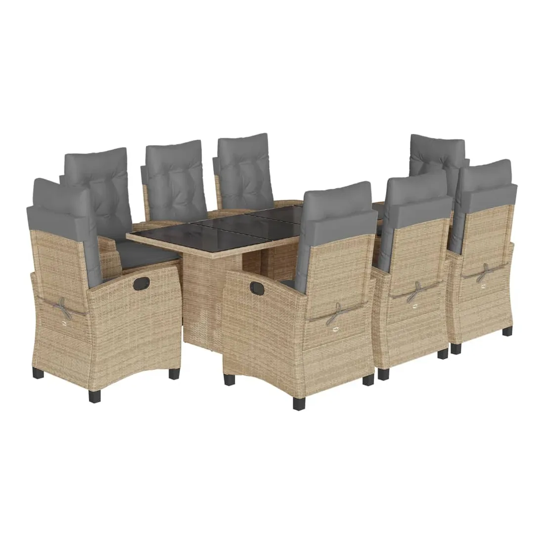 Cet ensemble de salle à manger de jardin est un excellent choix pour les repas en plein air ou pour vous détendre dans le jardin, l'arrière-cour ou le patio. Matériau durable : la résine tressée, également connue sous le nom de poly rotin, est un matériau synthétique solide et nécessitant peu d'entretien qui ressemble au rotin naturel. Il est léger, facile à nettoyer et couramment utilisé pour les meubles d'extérieur en raison de sa durabilité et de ses propriétés de résistance aux intempéries. Dossier réglable : ce siège de jardin est doté d'une poignée. Vous pouvez régler le dossier dans n'importe quelle position en tirant sur la poignée et le remettre rapidement dans sa position initiale.Dessus en verre : le dessus de la table d'extérieur est fabriqué en verre trempé solide et durable, ce qui le rend facile à nettoyer avec un chiffon humide et ajoute une touche d'élégance à votre espace extérieur. Expérience d'assise confortable : ce mobilier d'extérieur, doté de coussins épais, offre une expérience d'assise confortable. Housse amovible et lavable : ces coussins de siège sont dotés de housses amovibles pour un lavage et un entretien faciles. Bon à savoir :Pour que vos meubles d'extérieur restent beaux, nous vous recommandons de les protéger avec une housse imperméable.