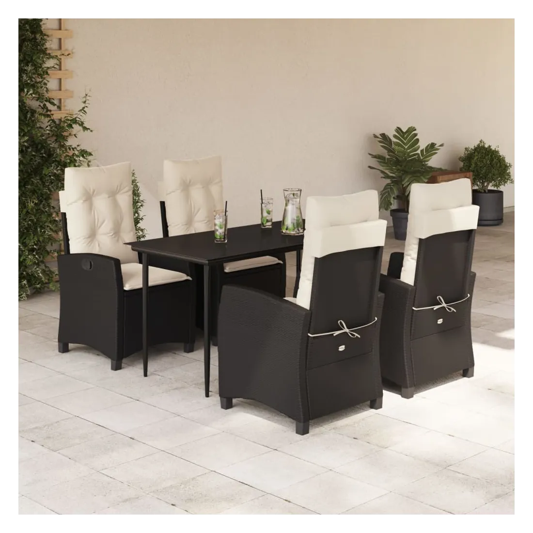 Cet ensemble de salle à manger de jardin est un excellent choix pour les repas en plein air ou pour vous détendre dans le jardin, l'arrière-cour ou le patio. Matériau durable : la résine tressée, également connue sous le nom de poly rotin, est un matériau synthétique solide et nécessitant peu d'entretien qui ressemble au rotin naturel. Il est léger, facile à nettoyer et couramment utilisé pour les meubles d'extérieur en raison de sa durabilité et de ses propriétés de résistance aux intempéries. Dossier réglable : ce siège de jardin est doté d'une poignée. Vous pouvez régler le dossier dans n'importe quelle position en tirant sur la poignée et le remettre rapidement dans sa position initiale.Dessus en verre : le dessus de la table d'extérieur est fabriqué en verre trempé solide et durable, ce qui le rend facile à nettoyer avec un chiffon humide et ajoute une touche d'élégance à votre espace extérieur. Expérience d'assise confortable : ce mobilier d'extérieur, doté de coussins épais, offre une expérience d'assise confortable. Housse amovible et lavable : ces coussins de siège sont dotés de housses amovibles pour un lavage et un entretien faciles. Bon à savoir :Pour que vos meubles d'extérieur restent beaux, nous vous recommandons de les protéger avec une housse imperméable.