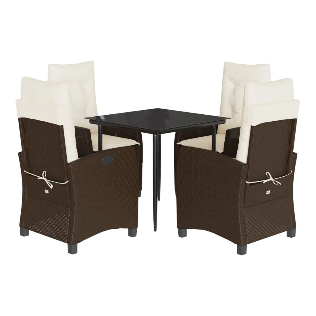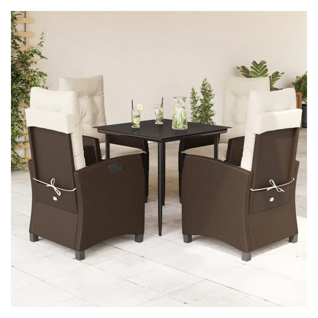 Cet ensemble de salle à manger de jardin est un excellent choix pour les repas en plein air ou pour vous détendre dans le jardin, l'arrière-cour ou le patio. Matériau durable : la résine tressée, également connue sous le nom de poly rotin, est un matériau synthétique solide et nécessitant peu d'entretien qui ressemble au rotin naturel. Il est léger, facile à nettoyer et couramment utilisé pour les meubles d'extérieur en raison de sa durabilité et de ses propriétés de résistance aux intempéries. Dossier réglable : ce siège de jardin est doté d'une poignée. Vous pouvez régler le dossier dans n'importe quelle position en tirant sur la poignée et le remettre rapidement dans sa position initiale.Dessus en verre : le dessus de la table d'extérieur est fabriqué en verre trempé solide et durable, ce qui le rend facile à nettoyer avec un chiffon humide et ajoute une touche d'élégance à votre espace extérieur. Expérience d'assise confortable : ce mobilier d'extérieur, doté de coussins épais, offre une expérience d'assise confortable. Housse amovible et lavable : ces coussins de siège sont dotés de housses amovibles pour un lavage et un entretien faciles. Bon à savoir :Pour que vos meubles d'extérieur restent beaux, nous vous recommandons de les protéger avec une housse imperméable.