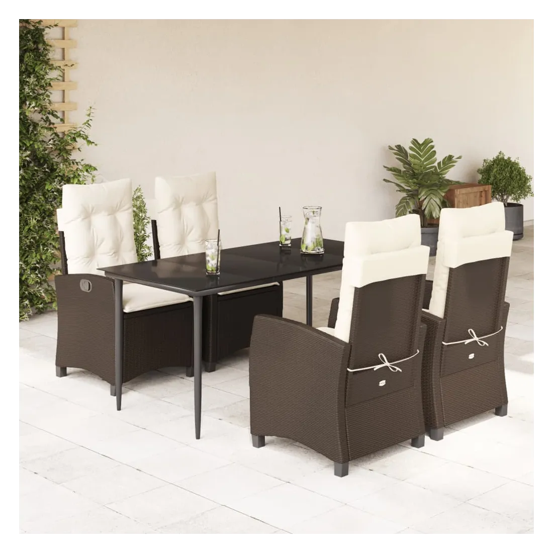 Cet ensemble de salle à manger de jardin est un excellent choix pour les repas en plein air ou pour vous détendre dans le jardin, l'arrière-cour ou le patio. Matériau durable : la résine tressée, également connue sous le nom de poly rotin, est un matériau synthétique solide et nécessitant peu d'entretien qui ressemble au rotin naturel. Il est léger, facile à nettoyer et couramment utilisé pour les meubles d'extérieur en raison de sa durabilité et de ses propriétés de résistance aux intempéries. Dossier réglable : ce siège de jardin est doté d'une poignée. Vous pouvez régler le dossier dans n'importe quelle position en tirant sur la poignée et le remettre rapidement dans sa position initiale.Dessus en verre : le dessus de la table d'extérieur est fabriqué en verre trempé solide et durable, ce qui le rend facile à nettoyer avec un chiffon humide et ajoute une touche d'élégance à votre espace extérieur. Expérience d'assise confortable : ce mobilier d'extérieur, doté de coussins épais, offre une expérience d'assise confortable. Housse amovible et lavable : ces coussins de siège sont dotés de housses amovibles pour un lavage et un entretien faciles. Bon à savoir :Pour que vos meubles d'extérieur restent beaux, nous vous recommandons de les protéger avec une housse imperméable.
