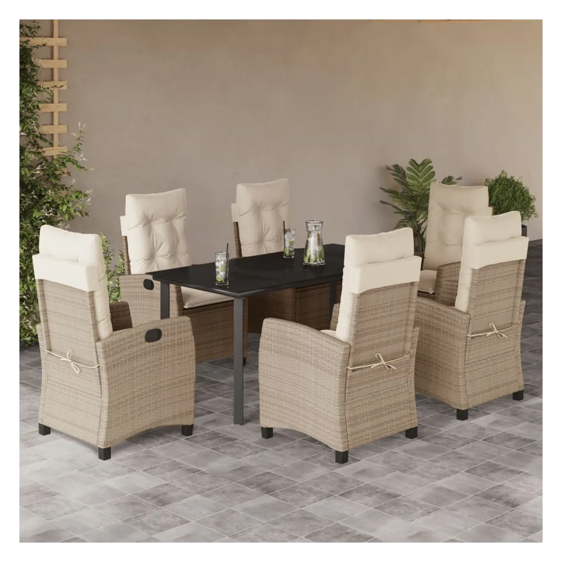 Cet ensemble de salle à manger de jardin est un excellent choix pour les repas en plein air ou pour vous détendre dans le jardin, l'arrière-cour ou le patio. Matériau durable : la résine tressée, également connue sous le nom de poly rotin, est un matériau synthétique solide et nécessitant peu d'entretien qui ressemble au rotin naturel. Il est léger, facile à nettoyer et couramment utilisé pour les meubles d'extérieur en raison de sa durabilité et de ses propriétés de résistance aux intempéries. Dossier réglable : ce siège de jardin est doté d'une poignée. Vous pouvez régler le dossier dans n'importe quelle position en tirant sur la poignée et le remettre rapidement dans sa position initiale.Dessus en verre : le dessus de la table d'extérieur est fabriqué en verre trempé solide et durable, ce qui le rend facile à nettoyer avec un chiffon humide et ajoute une touche d'élégance à votre espace extérieur. Expérience d'assise confortable : ce mobilier d'extérieur, doté de coussins épais, offre une expérience d'assise confortable. Housse amovible et lavable : ces coussins de siège sont dotés de housses amovibles pour un lavage et un entretien faciles. Bon à savoir :Pour que vos meubles d'extérieur restent beaux, nous vous recommandons de les protéger avec une housse imperméable.