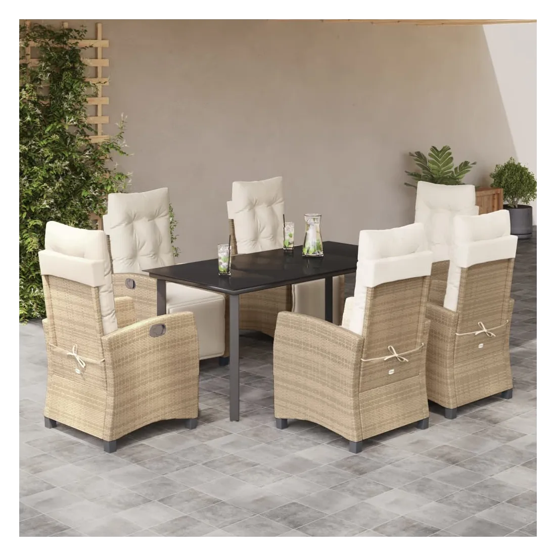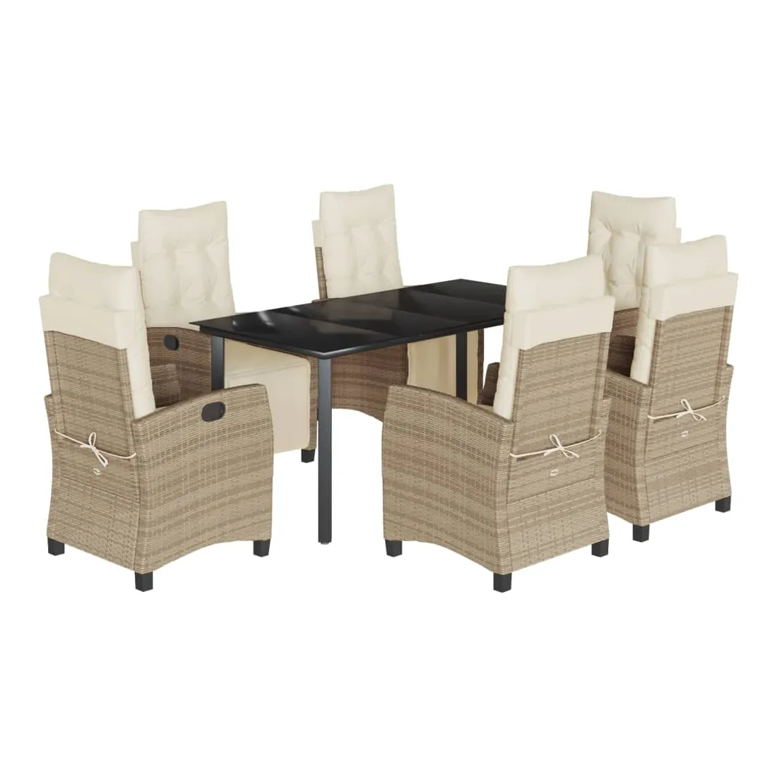 Cet ensemble de salle à manger de jardin est un excellent choix pour les repas en plein air ou pour vous détendre dans le jardin, l'arrière-cour ou le patio. Matériau durable : la résine tressée, également connue sous le nom de poly rotin, est un matériau synthétique solide et nécessitant peu d'entretien qui ressemble au rotin naturel. Il est léger, facile à nettoyer et couramment utilisé pour les meubles d'extérieur en raison de sa durabilité et de ses propriétés de résistance aux intempéries.Dossier et repose-pied réglables : ce siège de jardin est doté d'une poignée. Vous pouvez régler le dossier et le repose-pied dans n'importe quelle position en tirant sur la poignée, et les remettre rapidement dans leur position initiale.Dessus en verre : le dessus de la table d'extérieur est fabriqué en verre trempé solide et durable, ce qui le rend facile à nettoyer avec un chiffon humide et ajoute une touche d'élégance à votre espace extérieur.Expérience d'assise confortable : ce mobilier d'extérieur, doté de coussins épais, offre une expérience d'assise confortable.Housse amovible et lavable : ces coussins de siège sont dotés de housses amovibles pour un lavage et un entretien faciles. Bon à savoir :Pour que vos meubles d'extérieur restent beaux, nous vous recommandons de les protéger avec une housse imperméable.