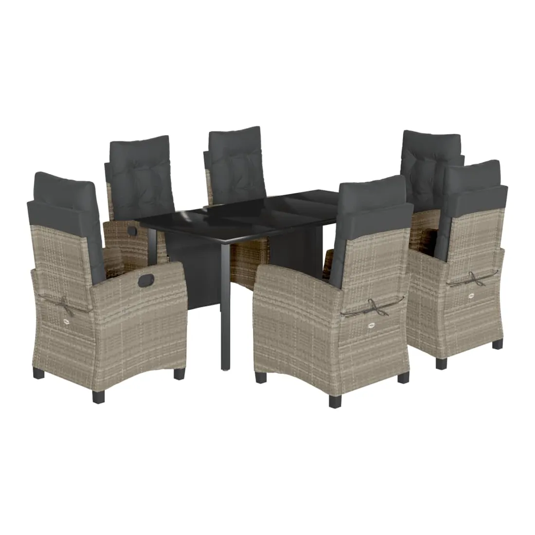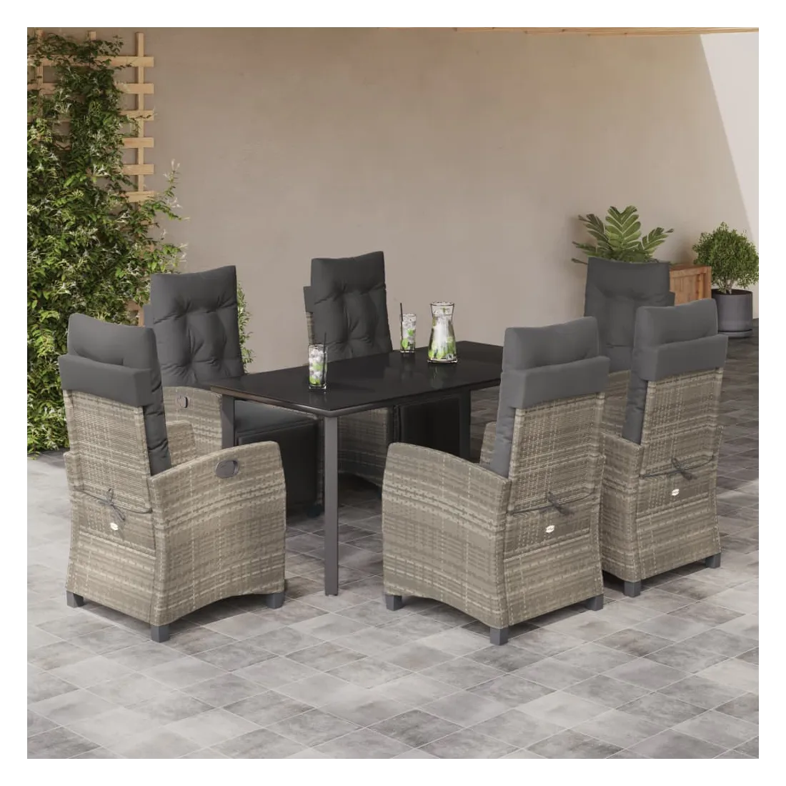 Cet ensemble de salle à manger de jardin est un excellent choix pour les repas en plein air ou pour vous détendre dans le jardin, l'arrière-cour ou le patio. Matériau durable : la résine tressée, également connue sous le nom de poly rotin, est un matériau synthétique solide et nécessitant peu d'entretien qui ressemble au rotin naturel. Il est léger, facile à nettoyer et couramment utilisé pour les meubles d'extérieur en raison de sa durabilité et de ses propriétés de résistance aux intempéries.Dossier et repose-pied réglables : ce siège de jardin est doté d'une poignée. Vous pouvez régler le dossier et le repose-pied dans n'importe quelle position en tirant sur la poignée, et les remettre rapidement dans leur position initiale.Dessus en verre : le dessus de la table d'extérieur est fabriqué en verre trempé solide et durable, ce qui le rend facile à nettoyer avec un chiffon humide et ajoute une touche d'élégance à votre espace extérieur.Expérience d'assise confortable : ce mobilier d'extérieur, doté de coussins épais, offre une expérience d'assise confortable.Housse amovible et lavable : ces coussins de siège sont dotés de housses amovibles pour un lavage et un entretien faciles. Bon à savoir :Pour que vos meubles d'extérieur restent beaux, nous vous recommandons de les protéger avec une housse imperméable.