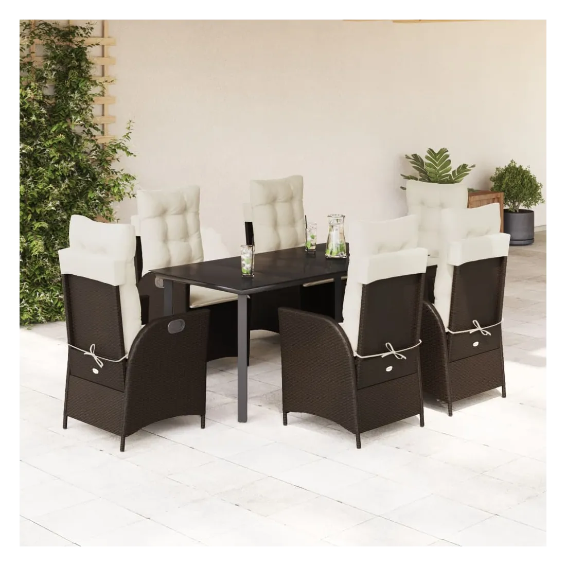 Cet ensemble de salle à manger de jardin est un excellent choix pour les repas en plein air ou pour vous détendre dans le jardin, dans l'arrière-cour ou sur la terrasse. Matériau durable : la résine tressée, également connue sous le nom de poly rotin, est un matériau synthétique solide et nécessitant peu d'entretien qui ressemble au rotin naturel. Il est léger, facile à nettoyer et couramment utilisé pour les meubles d'extérieur en raison de sa durabilité et de ses propriétés de résistance aux intempéries.Dossier réglable : ce siège de jardin est doté d'une poignée. Vous pouvez régler le dossier dans n'importe quelle position en tirant sur la poignée et le remettre rapidement dans sa position initiale.Expérience d'assise confortable : ce mobilier d'extérieur, doté de coussins épais, offre une expérience d'assise confortable.Housse amovible et lavable : ces coussins de siège sont dotés de housses amovibles pour un lavage et un entretien faciles. Les coussins de dossier ont un rabat à l'arrière pour une fixation facile aux dossiers.Dessus en verre : le dessus de la table d'extérieur est fabriqué en verre trempé solide et durable, ce qui le rend facile à nettoyer avec un chiffon humide et ajoute une touche d'élégance à votre espace extérieur. Bon à savoir : Pour que vos meubles d'extérieur restent beaux, nous vous recommandons de les protéger avec une housse imperméable.