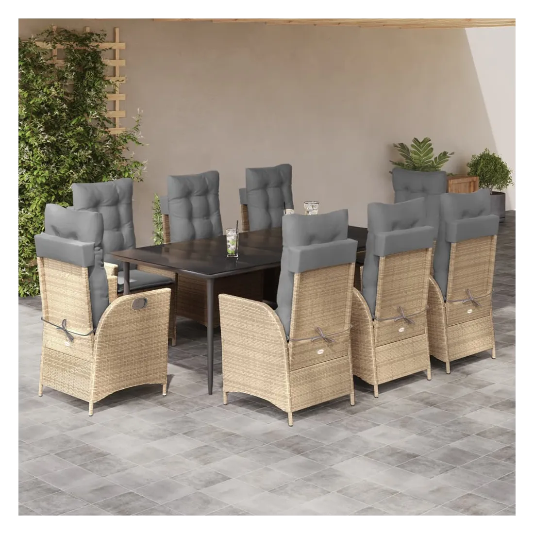 Cet ensemble de salle à manger de jardin est un excellent choix pour les repas en plein air ou pour vous détendre dans le jardin, dans l'arrière-cour ou sur la terrasse. Matériau durable : la résine tressée, également connue sous le nom de poly rotin, est un matériau synthétique solide et nécessitant peu d'entretien qui ressemble au rotin naturel. Il est léger, facile à nettoyer et couramment utilisé pour les meubles d'extérieur en raison de sa durabilité et de ses propriétés de résistance aux intempéries.Dossier réglable : ce siège de jardin est doté d'une poignée. Vous pouvez régler le dossier dans n'importe quelle position en tirant sur la poignée et le remettre rapidement dans sa position initiale.Expérience d'assise confortable : ce mobilier d'extérieur, doté de coussins épais, offre une expérience d'assise confortable.Housse amovible et lavable : ces coussins de siège sont dotés de housses amovibles pour un lavage et un entretien faciles. Les coussins de dossier ont un rabat à l'arrière pour une fixation facile aux dossiers.Dessus en verre : le dessus de la table d'extérieur est fabriqué en verre trempé solide et durable, ce qui le rend facile à nettoyer avec un chiffon humide et ajoute une touche d'élégance à votre espace extérieur. Bon à savoir : Pour que vos meubles d'extérieur restent beaux, nous vous recommandons de les protéger avec une housse imperméable.