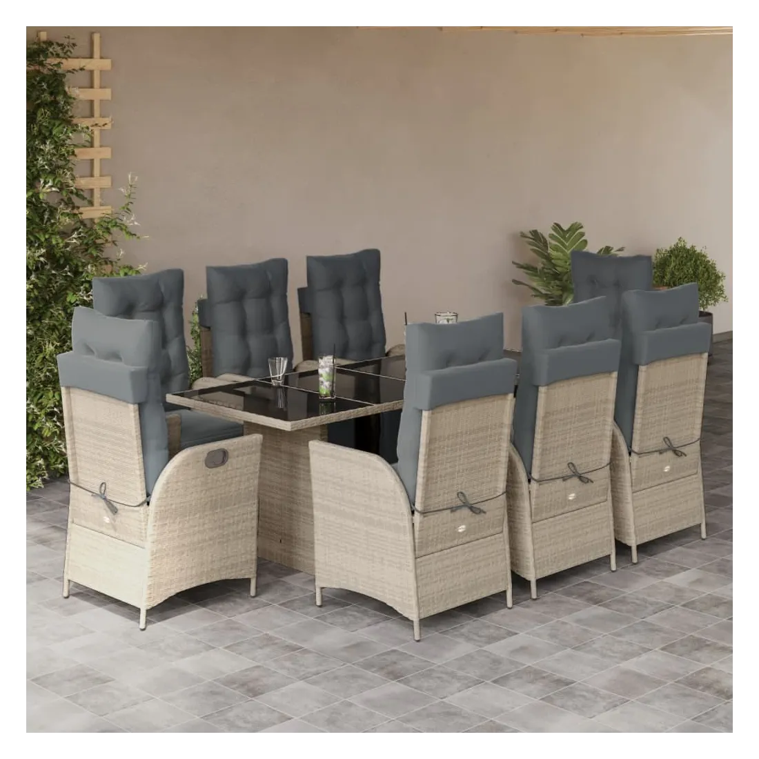 Cet ensemble de salle à manger de jardin est un excellent choix pour les repas en plein air ou pour vous détendre dans le jardin, l'arrière-cour ou le patio. Matériau durable : la résine tressée, également connue sous le nom de poly rotin, est un matériau synthétique solide et nécessitant peu d'entretien qui ressemble au rotin naturel. Il est léger, facile à nettoyer et couramment utilisé pour les meubles d'extérieur en raison de sa durabilité et de ses propriétés de résistance aux intempéries.Dossier et repose-pied réglables : ce siège de jardin est doté d'une poignée. Vous pouvez régler le dossier et le repose-pied dans n'importe quelle position en tirant sur la poignée, et les remettre rapidement dans leur position initiale.Expérience d'assise confortable : ce mobilier d'extérieur, doté de coussins épais, offre une expérience d'assise confortable.Housse amovible et lavable : ces coussins de siège sont dotés de housses amovibles pour un lavage et un entretien faciles. Les coussins de dossier ont un rabat à l'arrière pour une fixation facile aux dossiers.Dessus en verre : le dessus de la table d'extérieur est fabriqué en verre trempé solide et durable, ce qui le rend facile à nettoyer avec un chiffon humide et ajoute une touche d'élégance à votre espace extérieur. Bon à savoir :Pour que vos meubles d'extérieur restent beaux, nous vous recommandons de les protéger avec une housse imperméable.