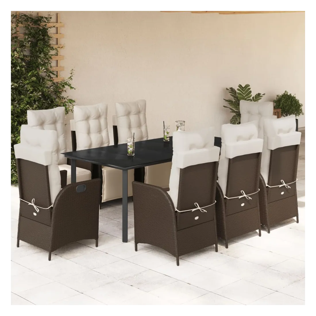 Cet ensemble de salle à manger de jardin est un excellent choix pour les repas en plein air ou pour vous détendre dans le jardin, l'arrière-cour ou le patio. Matériau durable : la résine tressée, également connue sous le nom de poly rotin, est un matériau synthétique solide et nécessitant peu d'entretien qui ressemble au rotin naturel. Il est léger, facile à nettoyer et couramment utilisé pour les meubles d'extérieur en raison de sa durabilité et de ses propriétés de résistance aux intempéries.Dossier et repose-pied réglables : ce siège de jardin est doté d'une poignée. Vous pouvez régler le dossier et le repose-pied dans n'importe quelle position en tirant sur la poignée, et les remettre rapidement dans leur position initiale.Expérience d'assise confortable : ce mobilier d'extérieur, doté de coussins épais, offre une expérience d'assise confortable.Housse amovible et lavable : ces coussins de siège sont dotés de housses amovibles pour un lavage et un entretien faciles. Les coussins de dossier ont un rabat à l'arrière pour une fixation facile aux dossiers.Dessus en verre : le dessus de la table d'extérieur est fabriqué en verre trempé solide et durable, ce qui le rend facile à nettoyer avec un chiffon humide et ajoute une touche d'élégance à votre espace extérieur. Bon à savoir :Pour que vos meubles d'extérieur restent beaux, nous vous recommandons de les protéger avec une housse imperméable.