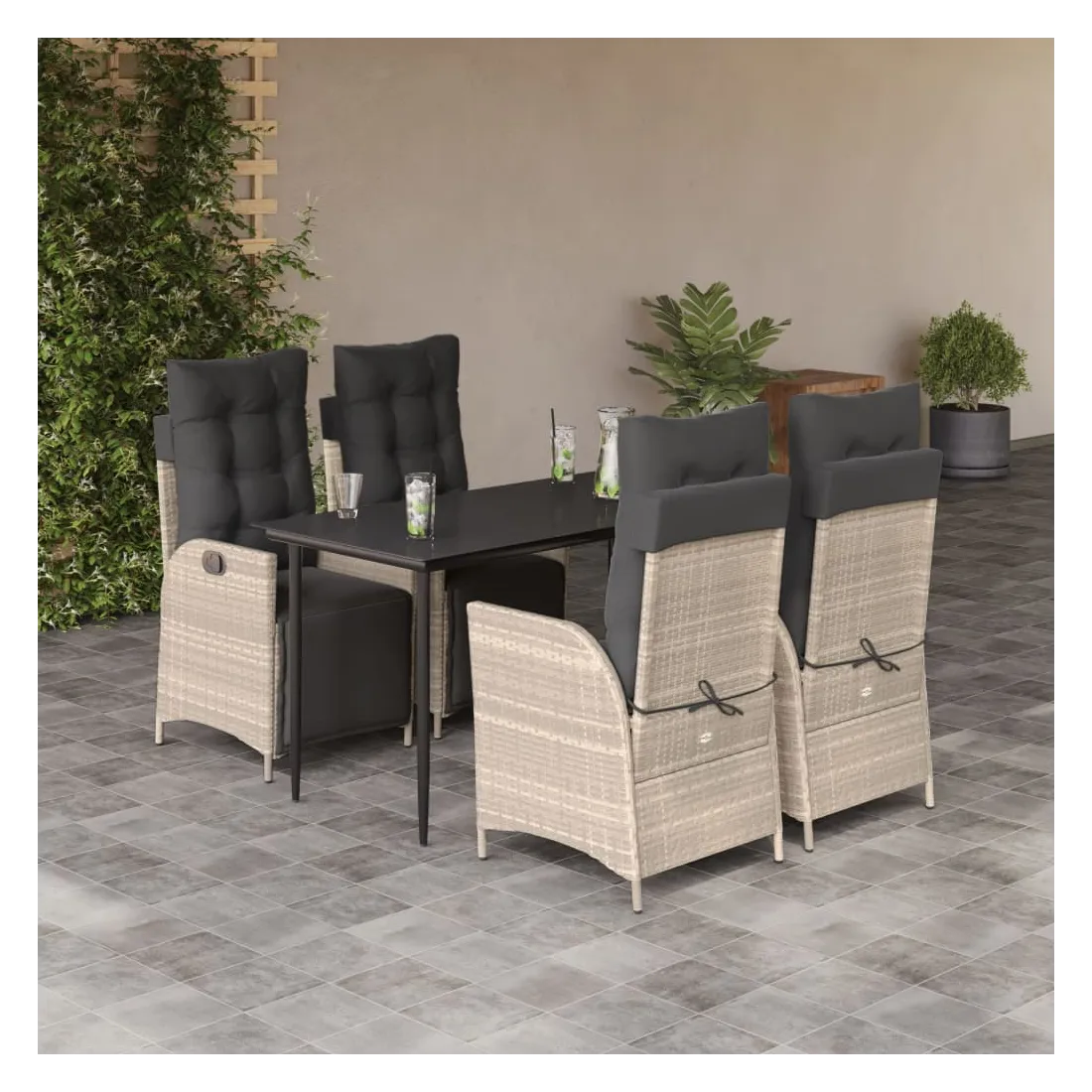 Cet ensemble de salle à manger de jardin est un excellent choix pour les repas en plein air ou pour vous détendre dans le jardin, l'arrière-cour ou le patio. Matériau durable : la résine tressée, également connue sous le nom de poly rotin, est un matériau synthétique solide et nécessitant peu d'entretien qui ressemble au rotin naturel. Il est léger, facile à nettoyer et couramment utilisé pour les meubles d'extérieur en raison de sa durabilité et de ses propriétés de résistance aux intempéries.Dossier et repose-pied réglables : ce siège de jardin est doté d'une poignée. Vous pouvez régler le dossier et le repose-pied dans n'importe quelle position en tirant sur la poignée, et les remettre rapidement dans leur position initiale.Expérience d'assise confortable : ce mobilier d'extérieur, doté de coussins épais, offre une expérience d'assise confortable.Housse amovible et lavable : ces coussins de siège sont dotés de housses amovibles pour un lavage et un entretien faciles. Les coussins de dossier ont un rabat à l'arrière pour une fixation facile aux dossiers.Dessus en verre : le dessus de la table d'extérieur est fabriqué en verre trempé solide et durable, ce qui le rend facile à nettoyer avec un chiffon humide et ajoute une touche d'élégance à votre espace extérieur. Bon à savoir :Pour que vos meubles d'extérieur restent beaux, nous vous recommandons de les protéger avec une housse imperméable.