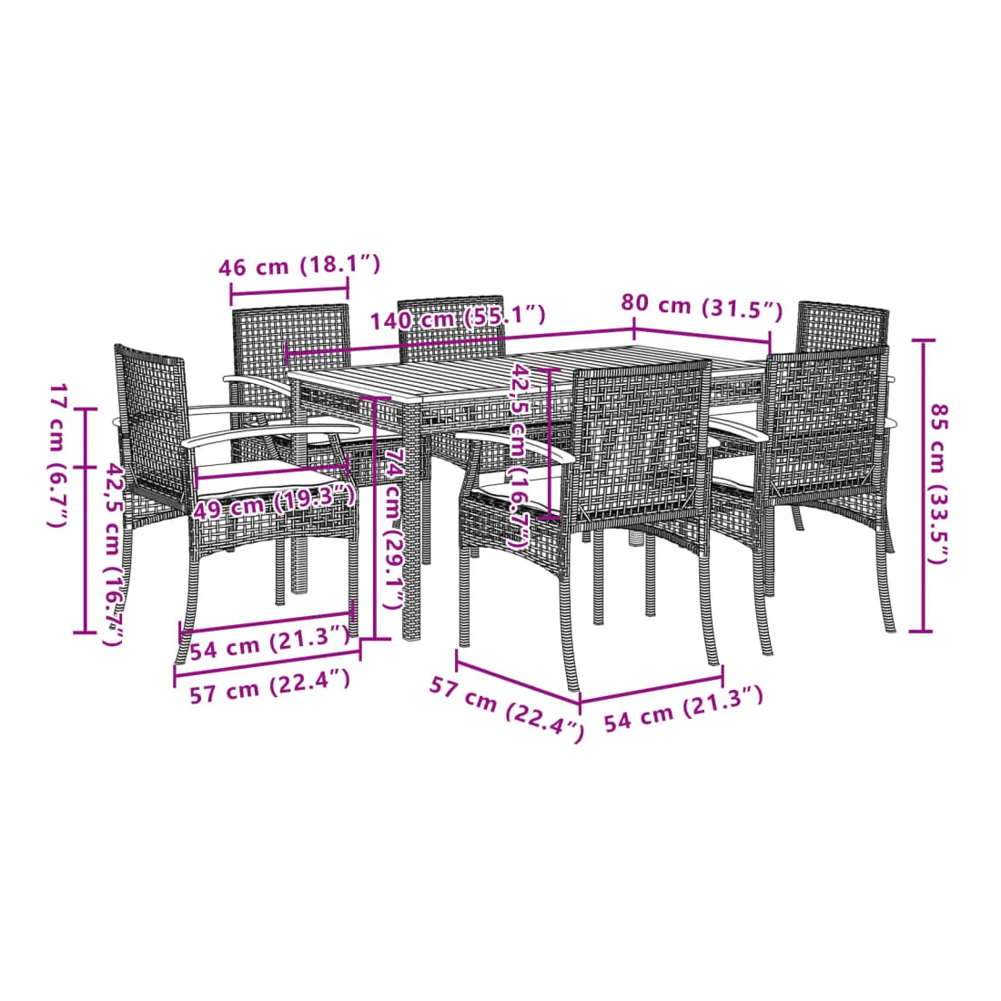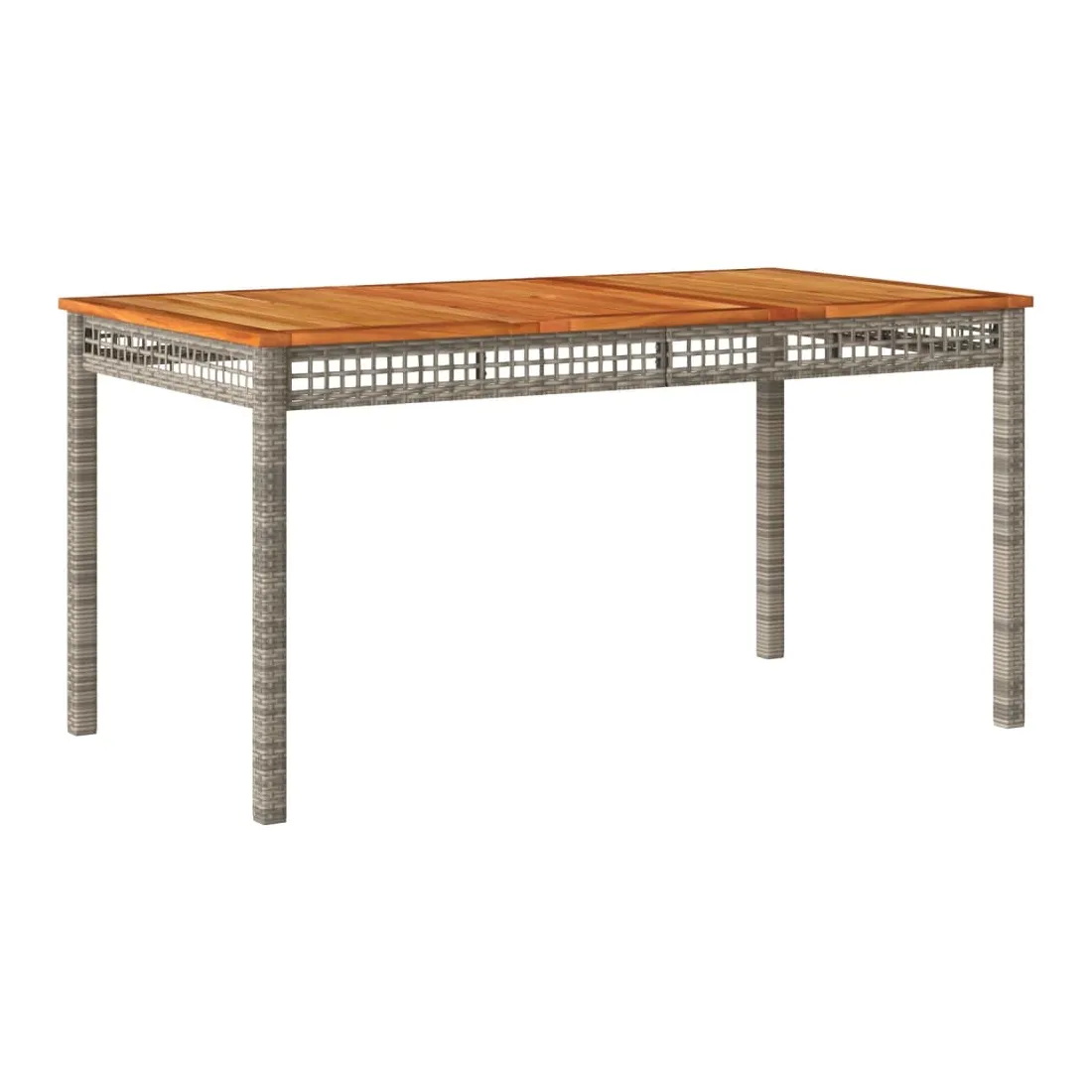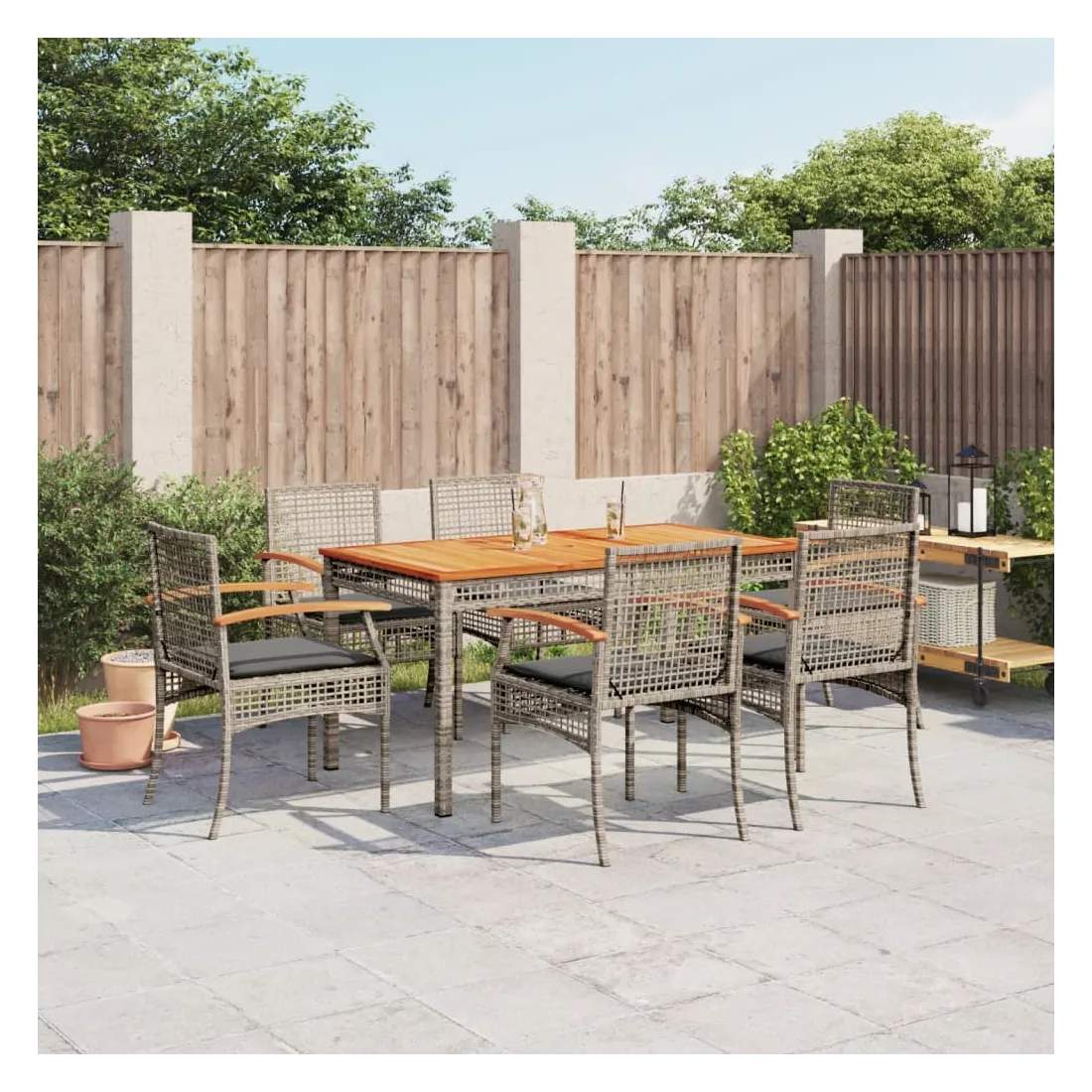 Cet ensemble de salle à manger de jardin est un excellent choix pour les repas en plein air ou pour vous détendre dans le jardin, dans l'arrière-cour ou sur la terrasse. Matériau durable : la résine tressée, également connue sous le nom de poly rotin, est un matériau synthétique solide et nécessitant peu d'entretien qui ressemble au rotin naturel. Il est léger, facile à nettoyer et couramment utilisé pour les meubles d'extérieur en raison de sa durabilité et de ses propriétés de résistance aux intempéries.Expérience d'assise confortable : ce mobilier d'extérieur, doté de coussins épais, offre une expérience d'assise confortable.Housse amovible et lavable : ces coussins de siège sont dotés de housses amovibles pour un lavage et un entretien faciles.Dessus stable et facile à nettoyer : cette table de jardin a un dessus en bois d'acacia robuste, durable et facile à nettoyer avec un chiffon humide.Cadre robuste et stable : le cadre en acier enduit de poudre assure la solidité et la stabilité du meuble de jardin pour une utilisation quotidienne à l'extérieur. Bon à savoir :Pour que vos meubles d'extérieur restent beaux, nous vous recommandons de les protéger avec une housse imperméable.