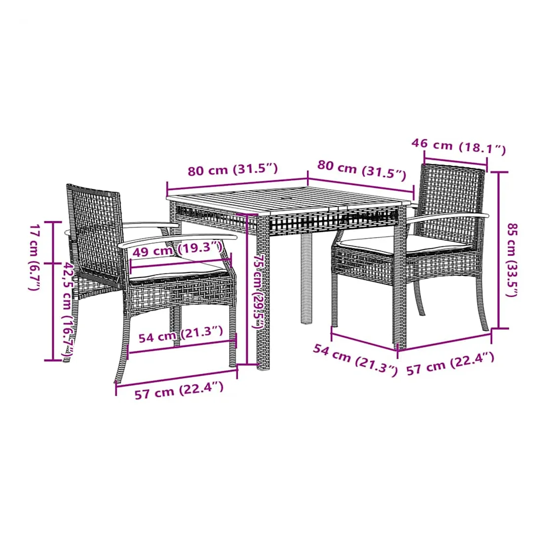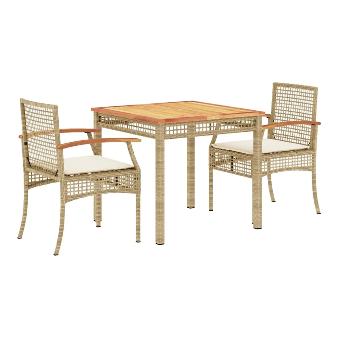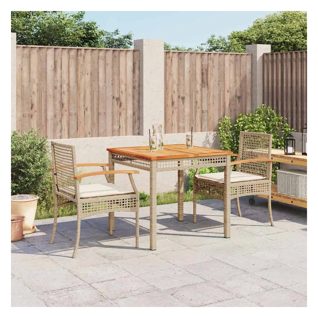 Cet ensemble de salle à manger de jardin est un excellent choix pour les repas en plein air ou pour vous détendre dans le jardin, dans l'arrière-cour ou sur la terrasse. Matériau durable : la résine tressée, également connue sous le nom de poly rotin, est un matériau synthétique solide et nécessitant peu d'entretien qui ressemble au rotin naturel. Il est léger, facile à nettoyer et couramment utilisé pour les meubles d'extérieur en raison de sa durabilité et de ses propriétés de résistance aux intempéries.Expérience d'assise confortable : ce mobilier d'extérieur, doté de coussins épais, offre une expérience d'assise confortable.Housse amovible et lavable : ces coussins de siège sont dotés de housses amovibles pour un lavage et un entretien faciles.Dessus stable et facile à nettoyer : cette table de jardin a un dessus en bois d'acacia robuste, durable et facile à nettoyer avec un chiffon humide.Cadre robuste et stable : le cadre en acier enduit de poudre assure la solidité et la stabilité du meuble de jardin pour une utilisation quotidienne à l'extérieur. Bon à savoir :Pour que vos meubles d'extérieur restent beaux, nous vous recommandons de les protéger avec une housse imperméable.