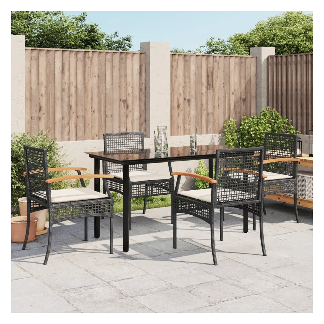 Cet ensemble de salle à manger de jardin est un excellent choix pour les repas en plein air ou pour vous détendre dans le jardin, dans l'arrière-cour ou sur la terrasse. Matériau durable : la résine tressée, également connue sous le nom de poly rotin, est un matériau synthétique solide et nécessitant peu d'entretien qui ressemble au rotin naturel. Il est léger, facile à nettoyer et couramment utilisé pour les meubles d'extérieur en raison de sa durabilité et de ses propriétés de résistance aux intempéries.Expérience d'assise confortable : ce mobilier d'extérieur, doté de coussins épais, offre une expérience d'assise confortable.Housse amovible et lavable : ces coussins de siège sont dotés de housses amovibles pour un lavage et un entretien faciles.Dessus en verre : le dessus de la table d'extérieur est fabriqué en verre trempé solide et durable, ce qui le rend facile à nettoyer avec un chiffon humide et ajoute une touche d'élégance à votre espace extérieur.Cadre robuste et stable : le cadre en acier enduit de poudre assure la solidité et la stabilité du meuble de jardin pour une utilisation quotidienne à l'extérieur. Bon à savoir :Pour que vos meubles d'extérieur restent beaux, nous vous recommandons de les protéger avec une housse imperméable.