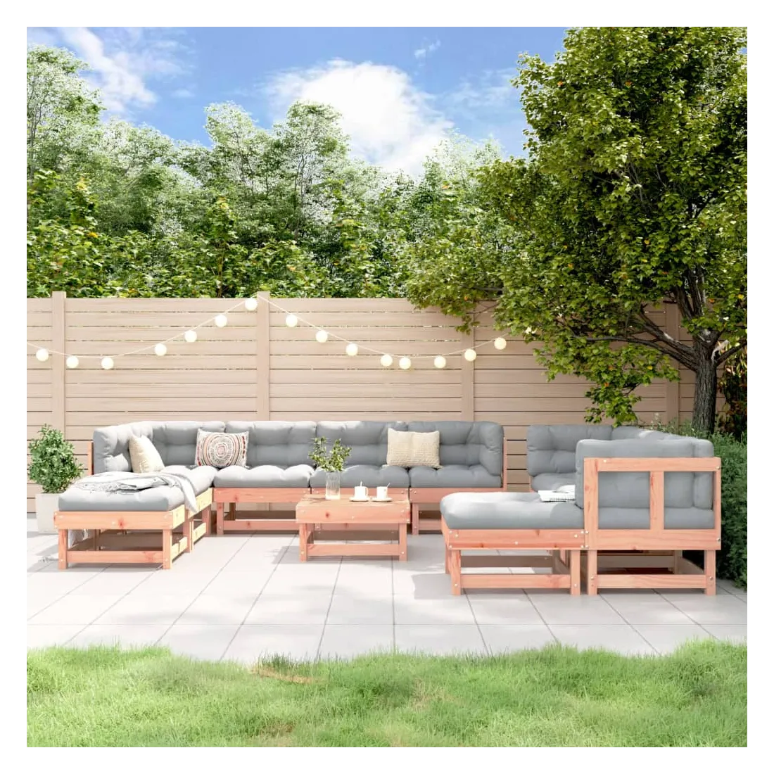 Ce salon de jardin en bois, qui se démarque par son design à lattes, sera un excellent supplément à votre jardin, patio ou terrasse pour profiter d'un moment agréable avec votre famille ou vos amis. Bois de douglas massif : le bois de douglas massif est un bois très durable qui fonctionne bien pour l'extérieur. Le bois de douglas est également suffisamment solide pour être travaillé avec un minimum de soin, même sous l'influence des intempéries.Expérience d'assise confortable : le dossier ajoute un confort d'assise supplémentaire au canapé d'extérieur.Design modulaire : le canapé est flexible et facile à déplacer. Vous pouvez le combiner avec d'autres segments modulaires de la boutique en ligne pour créer vos propres configurations de salon de jardin ! Bon à savoir :Pour que vos meubles d'extérieur restent beaux, nous vous recommandons de les protéger avec une housse imperméable.Les coussins ne sont pas inclus dans la livraison.