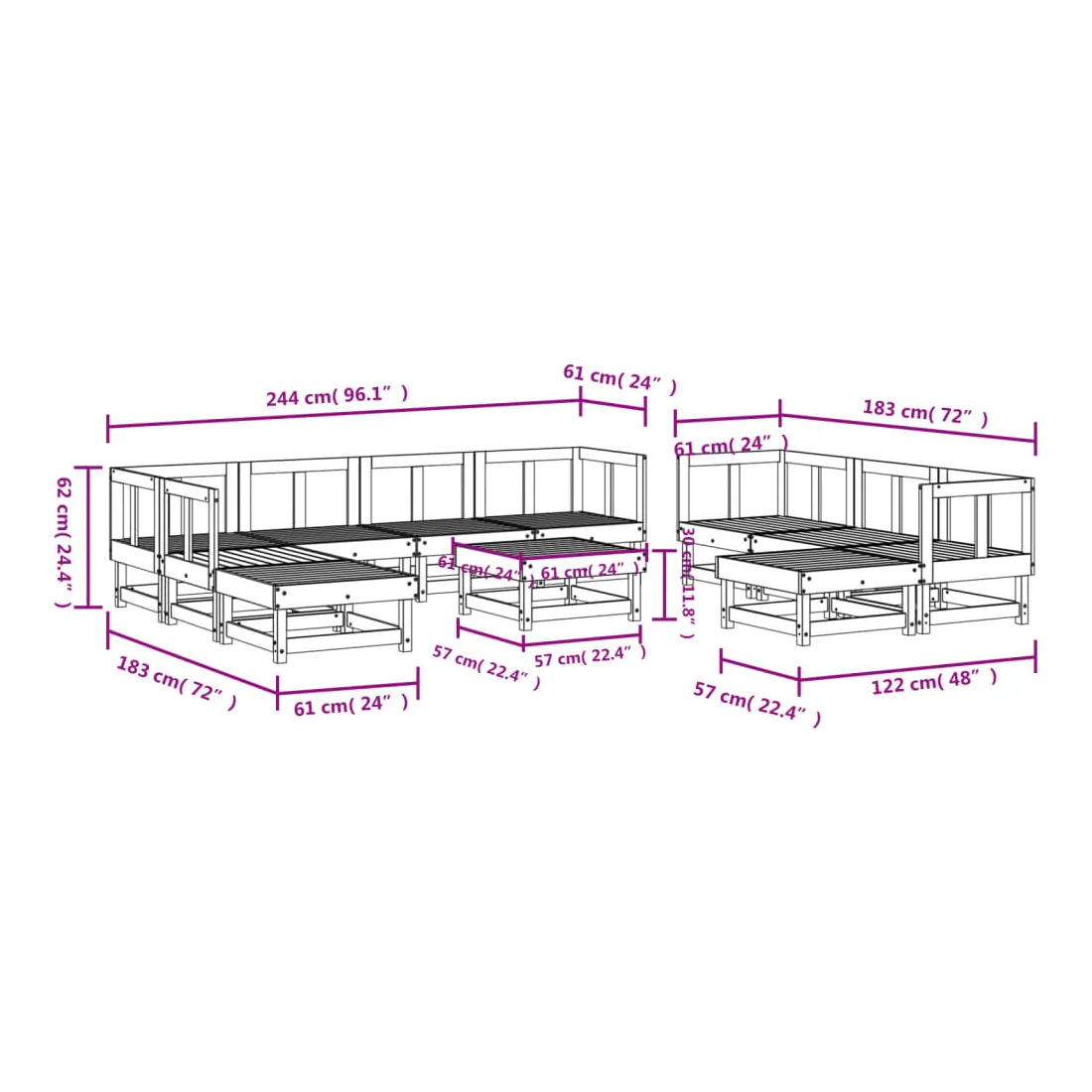 - Dimensions du canapé central : 61 x 61 x 62 cm (L x l x H)