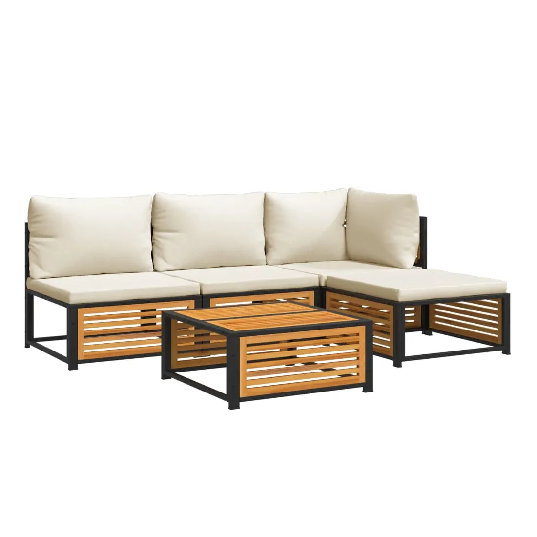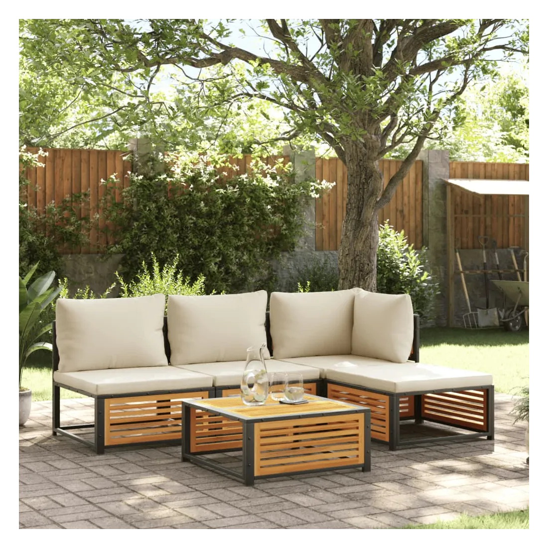 Cet ensemble de canapés de jardin est le complément parfait de votre arrière-cour, terrasse ou patio, offrant un espace confortable et accueillant pour discuter avec la famille et les amis ou simplement se détendre et profiter de l'extérieur. Cadre robuste et stable : le bois d'acacia massif est connu pour sa solidité et sa durabilité. Ses couleurs variées et ses grains uniques lui confèrent un aspect attrayant. Sa stabilité et sa résistance aux intempéries en font un matériau idéal pour la fabrication de meubles d'intérieur et d'extérieur. De plus, le cadre en acier enduit de poudre garantit la solidité et la stabilité du mobilier de jardin pour une utilisation quotidienne en extérieur. Dessus stable et facile à nettoyer : cette table de jardin a un dessus en bois d'acacia robuste, durable et facile à nettoyer avec un chiffon humide. Bonne ventilation et prévention de l'accumulation d'eau : la conception à lattes favorise une circulation optimale de l'air et empêche efficacement l'accumulation d'eau, assurant ainsi un mobilier de jardin sec et confortable.Expérience d'assise confortable : ce mobilier d'extérieur, doté de coussins épais, offre une expérience d'assise confortable. Housse amovible et lavable : ces coussins de siège sont dotés de housses amovibles pour un lavage et un entretien faciles. Bon à savoir :Pour que vos meubles d'extérieur restent beaux, nous vous recommandons de les protéger avec une housse imperméable.