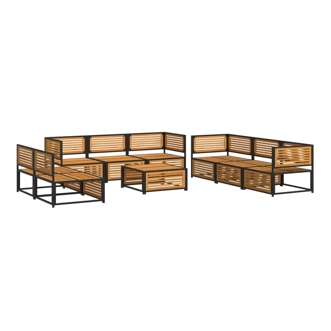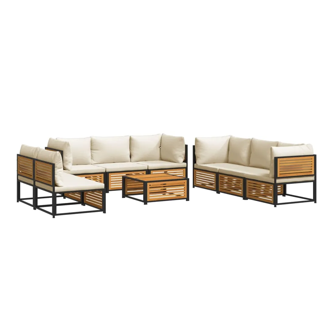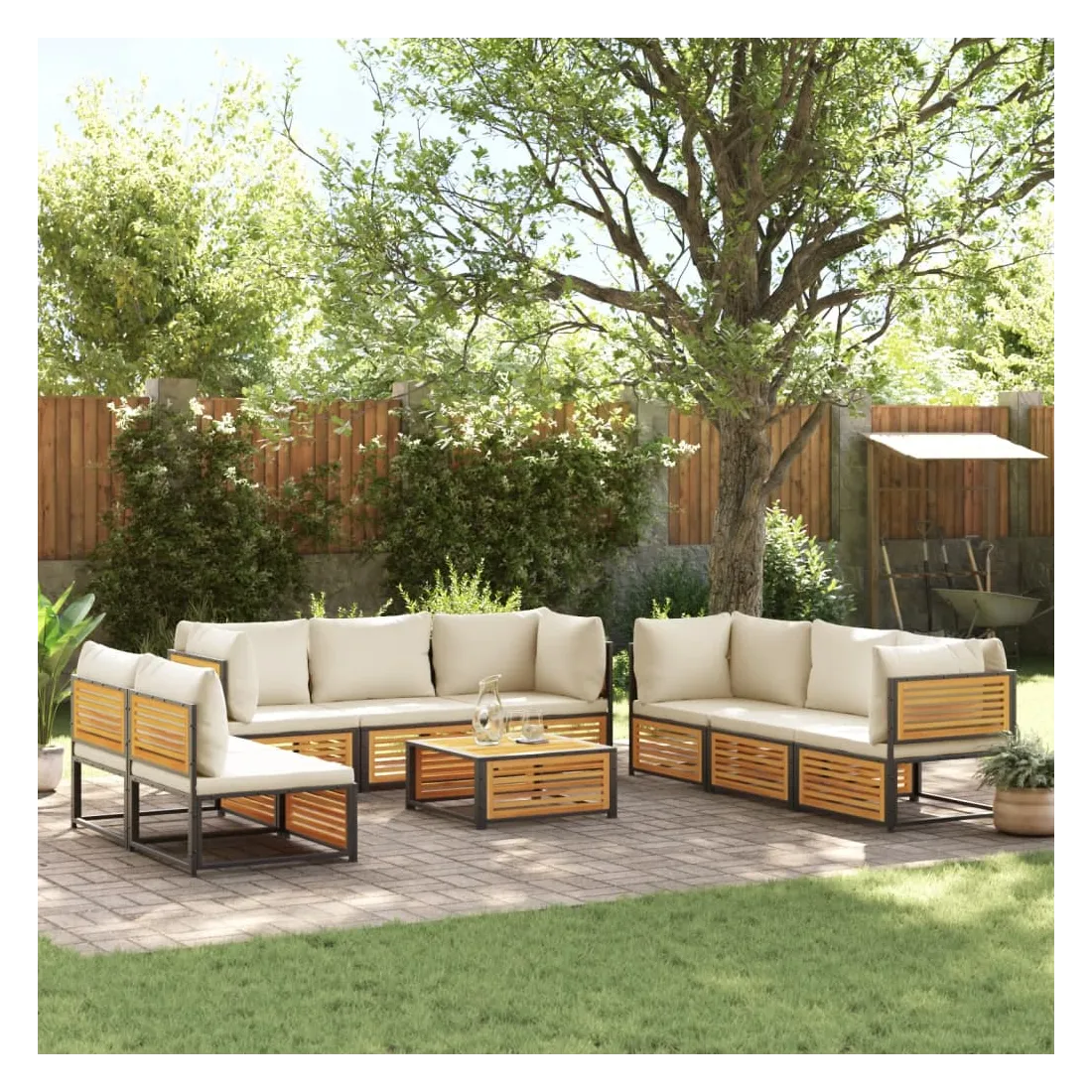 Cet ensemble de canapés de jardin est le complément parfait de votre arrière-cour, terrasse ou patio, offrant un espace confortable et accueillant pour discuter avec la famille et les amis ou simplement se détendre et profiter de l'extérieur. Cadre robuste et stable : le bois d'acacia massif est connu pour sa solidité et sa durabilité. Ses couleurs variées et ses grains uniques lui confèrent un aspect attrayant. Sa stabilité et sa résistance aux intempéries en font un matériau idéal pour la fabrication de meubles d'intérieur et d'extérieur. De plus, le cadre en acier enduit de poudre garantit la solidité et la stabilité du mobilier de jardin pour une utilisation quotidienne en extérieur. Dessus stable et facile à nettoyer : cette table de jardin a un dessus en bois d'acacia robuste, durable et facile à nettoyer avec un chiffon humide. Bonne ventilation et prévention de l'accumulation d'eau : la conception à lattes favorise une circulation optimale de l'air et empêche efficacement l'accumulation d'eau, assurant ainsi un mobilier de jardin sec et confortable.Expérience d'assise confortable : ce mobilier d'extérieur, doté de coussins épais, offre une expérience d'assise confortable. Housse amovible et lavable : ces coussins de siège sont dotés de housses amovibles pour un lavage et un entretien faciles. Bon à savoir :Pour que vos meubles d'extérieur restent beaux, nous vous recommandons de les protéger avec une housse imperméable.