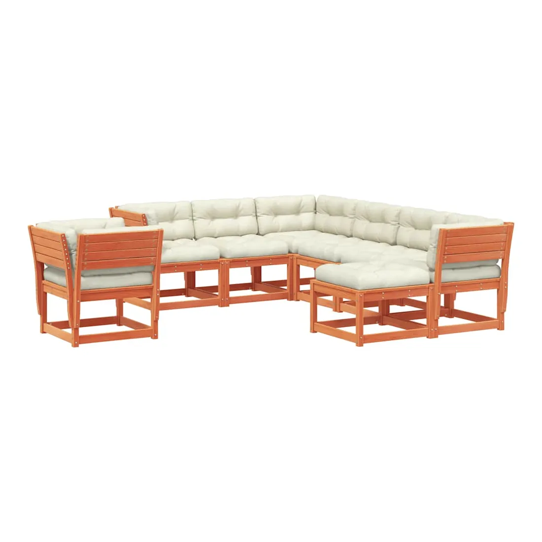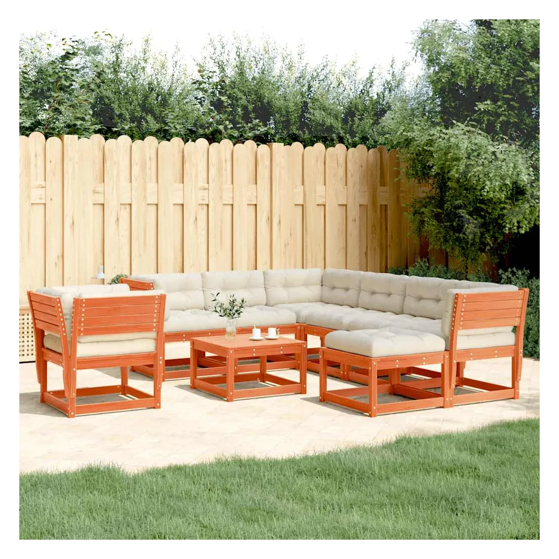Cet ensemble de salon de jardin en bois a un design élégant et constitue un excellent choix pour vous détendre et profiter du jardin ou du patio. Bois de pin massif : le bois de pin massif est un matériau naturel magnifique. Le bois de pin a un grain droit et les nœuds donnent au matériau son aspect caractéristique et rustique. Design à lattes : le design à lattes du meuble en bois empêche l'accumulation de l'eau, ce qui permet de garder le siège au sec et empêchant la pourriture indésirable. Expérience d'assise confortable : le dossier et l'accoudoir ajoutent un confort d'assise supplémentaire à l'ensemble de meubles de jardin. De plus, le coussin bien rembourré vous permet de vous asseoir confortablement. Conception modulaire : cet ensemble de meubles d'extérieur a une conception modulaire, ce qui le rend complètement flexible et facile à déplacer, afin que vous puissiez créer un agencement de meubles d'extérieur personnalisé. Bon à savoir :Pour que vos meubles d'extérieur restent beaux, nous vous recommandons de les protéger avec une housse imperméable.