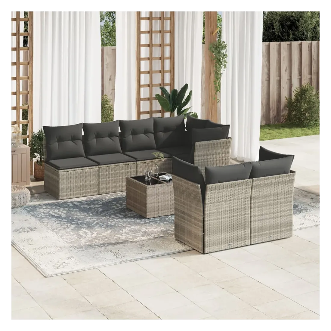 Cet ensemble de canapés de jardin est le complément parfait de votre arrière-cour, terrasse ou patio, offrant un espace confortable et accueillant pour discuter avec la famille et les amis ou simplement se détendre et profiter de l'extérieur. Matériau durable : la résine tressée, également connue sous le nom de poly rotin, est un matériau synthétique solide et nécessitant peu d'entretien qui ressemble au rotin naturel. Il est léger, facile à nettoyer et couramment utilisé pour les meubles d'extérieur en raison de sa durabilité et de ses propriétés de résistance aux intempéries.Expérience d'assise confortable : cet ensemble de meubles d'extérieur, doté de coussins épais, offre une expérience d'assise confortable.Housse amovible et lavable : ces coussins de siège sont dotés de housses amovibles pour un lavage et un entretien faciles.Dessus en verre : le dessus de la table d'extérieur est fabriqué en verre trempé solide et durable, ce qui le rend facile à nettoyer avec un chiffon humide et ajoute une touche d'élégance à votre espace extérieur.Conception modulaire : cet ensemble de meubles d'extérieur a une conception modulaire, ce qui le rend complètement flexible et facile à déplacer, afin que vous puissiez créer un agencement de meubles d'extérieur personnalisé. Bon à savoir :Pour que vos meubles d'extérieur restent beaux, nous vous recommandons de les protéger avec une housse imperméable.