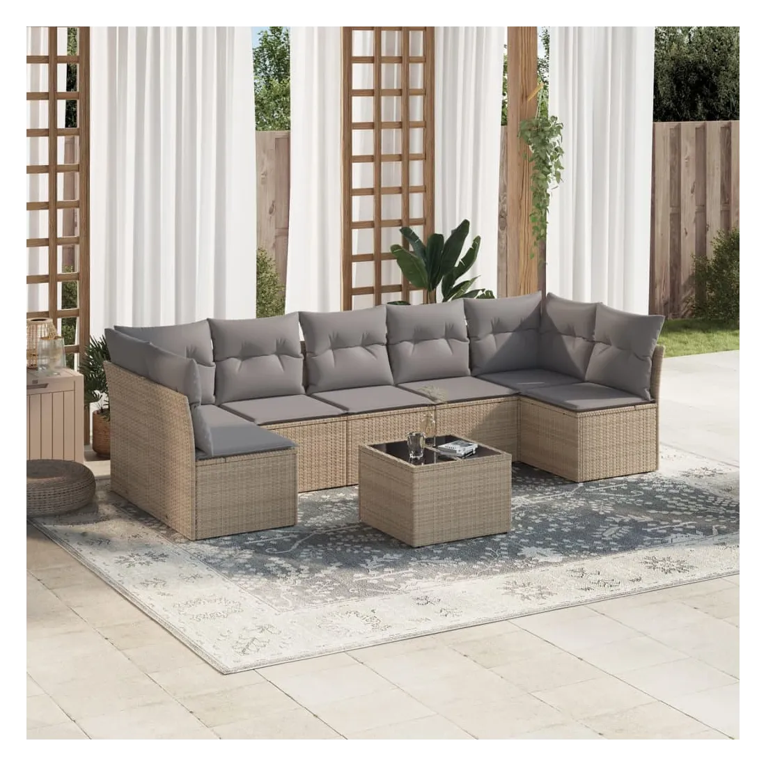 Cet ensemble de canapés de jardin est le complément parfait de votre arrière-cour, terrasse ou patio, offrant un espace confortable et accueillant pour discuter avec la famille et les amis ou simplement se détendre et profiter de l'extérieur. Matériau durable : la résine tressée, également connue sous le nom de poly rotin, est un matériau synthétique solide et nécessitant peu d'entretien qui ressemble au rotin naturel. Il est léger, facile à nettoyer et couramment utilisé pour les meubles d'extérieur en raison de sa durabilité et de ses propriétés de résistance aux intempéries.Expérience d'assise confortable : cet ensemble de meubles d'extérieur, doté de coussins épais, offre une expérience d'assise confortable.Housse amovible et lavable : ces coussins de siège sont dotés de housses amovibles pour un lavage et un entretien faciles.Dessus en verre : le dessus de la table d'extérieur est fabriqué en verre trempé solide et durable, ce qui le rend facile à nettoyer avec un chiffon humide et ajoute une touche d'élégance à votre espace extérieur.Conception modulaire : cet ensemble de meubles d'extérieur a une conception modulaire, ce qui le rend complètement flexible et facile à déplacer, afin que vous puissiez créer un agencement de meubles d'extérieur personnalisé. Bon à savoir :Pour que vos meubles d'extérieur restent beaux, nous vous recommandons de les protéger avec une housse imperméable.