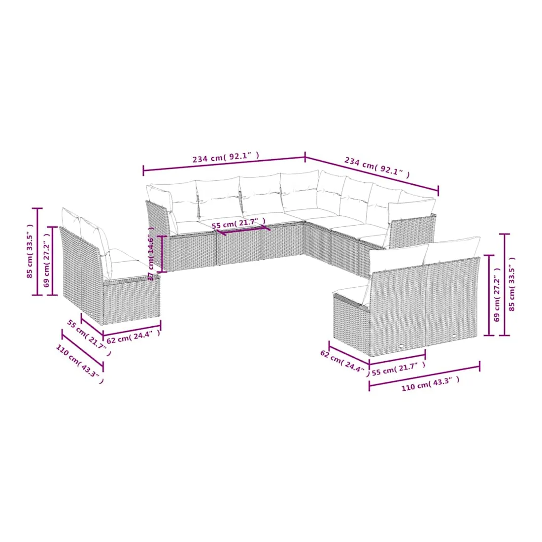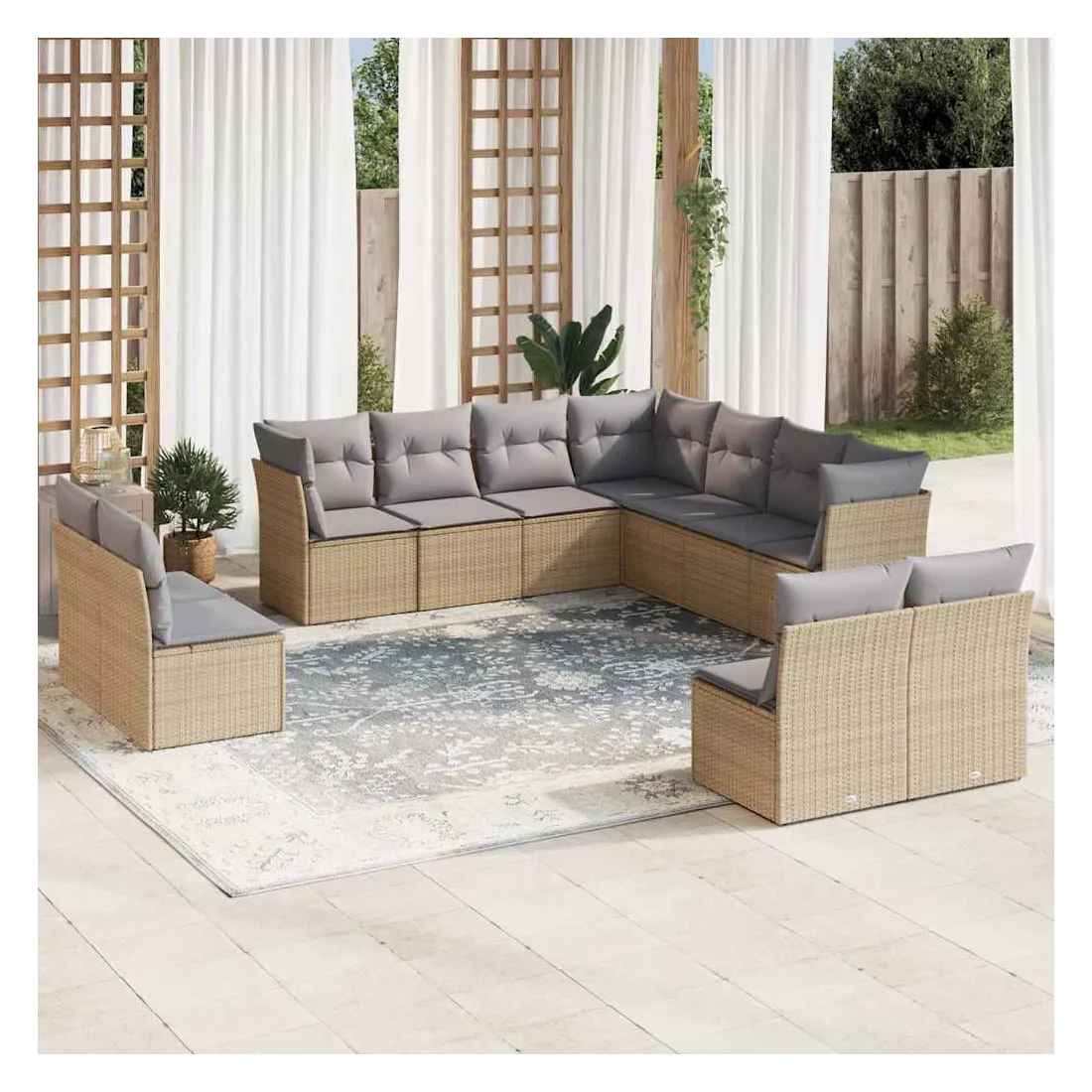 Cet ensemble de canapés de jardin est le complément parfait de votre arrière-cour, terrasse ou patio, offrant un espace confortable et accueillant pour discuter avec la famille et les amis ou simplement se détendre et profiter de l'extérieur. Matériau durable : la résine tressée, également connue sous le nom de poly rotin, est un matériau synthétique solide et nécessitant peu d'entretien qui ressemble au rotin naturel. Il est léger, facile à nettoyer et couramment utilisé pour les meubles d'extérieur en raison de sa durabilité et de ses propriétés de résistance aux intempéries.Expérience d'assise confortable : ce mobilier d'extérieur, doté de coussins épais, offre une expérience d'assise confortable.Housse amovible et lavable : ces coussins de siège sont dotés de housses amovibles pour un lavage et un entretien faciles.Conception modulaire : cet ensemble de meubles d'extérieur a une conception modulaire, ce qui le rend complètement flexible et facile à déplacer, afin que vous puissiez créer un agencement de meubles d'extérieur personnalisé. Bon à savoir :Pour que vos meubles d'extérieur restent beaux, nous vous recommandons de les protéger avec une housse imperméable.