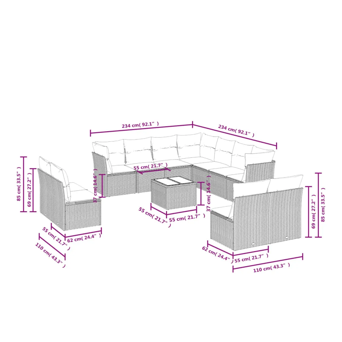 Cet ensemble de canapés de jardin est le complément parfait de votre arrière-cour, terrasse ou patio, offrant un espace confortable et accueillant pour discuter avec la famille et les amis ou simplement se détendre et profiter de l'extérieur. Matériau durable : la résine tressée, également connue sous le nom de poly rotin, est un matériau synthétique solide et nécessitant peu d'entretien qui ressemble au rotin naturel. Il est léger, facile à nettoyer et couramment utilisé pour les meubles d'extérieur en raison de sa durabilité et de ses propriétés de résistance aux intempéries.Expérience d'assise confortable : ce mobilier d'extérieur, doté de coussins épais, offre une expérience d'assise confortable.Dessus en verre : le dessus de la table d'extérieur est fabriqué en verre trempé solide et durable, ce qui le rend facile à nettoyer avec un chiffon humide et ajoute une touche d'élégance à votre espace extérieur.Housse amovible et lavable : ces coussins de siège sont dotés de housses amovibles pour un lavage et un entretien faciles.Conception modulaire : cet ensemble de meubles d'extérieur a une conception modulaire, ce qui le rend complètement flexible et facile à déplacer, afin que vous puissiez créer un agencement de meubles d'extérieur personnalisé. Bon à savoir :Pour que vos meubles d'extérieur restent beaux, nous vous recommandons de les protéger avec une housse imperméable.