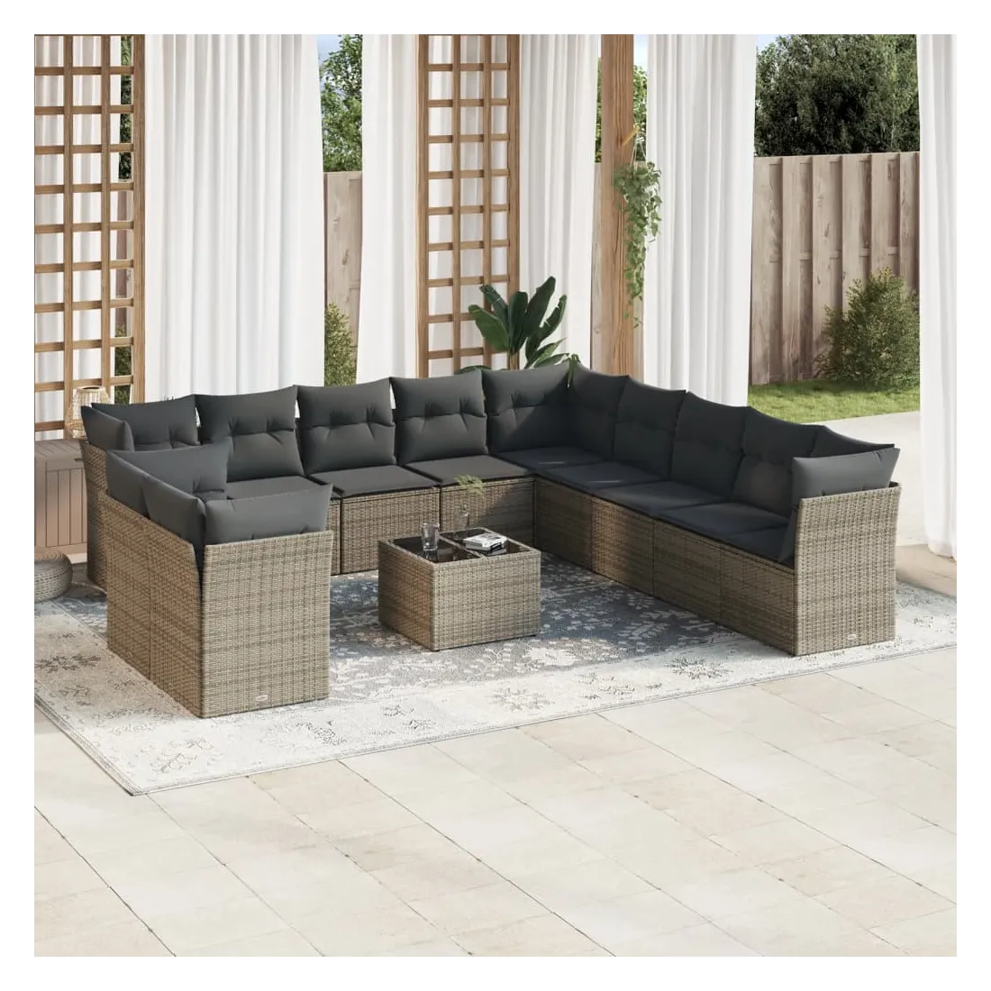 Cet ensemble de canapés de jardin est le complément parfait de votre arrière-cour, terrasse ou patio, offrant un espace confortable et accueillant pour discuter avec la famille et les amis ou simplement se détendre et profiter de l'extérieur. Matériau durable : la résine tressée, également connue sous le nom de poly rotin, est un matériau synthétique solide et nécessitant peu d'entretien qui ressemble au rotin naturel. Il est léger, facile à nettoyer et couramment utilisé pour les meubles d'extérieur en raison de sa durabilité et de ses propriétés de résistance aux intempéries.Expérience d'assise confortable : ce mobilier d'extérieur, doté de coussins épais, offre une expérience d'assise confortable.Dessus en verre : le dessus de la table d'extérieur est fabriqué en verre trempé solide et durable, ce qui le rend facile à nettoyer avec un chiffon humide et ajoute une touche d'élégance à votre espace extérieur.Housse amovible et lavable : ces coussins de siège sont dotés de housses amovibles pour un lavage et un entretien faciles.Conception modulaire : cet ensemble de meubles d'extérieur a une conception modulaire, ce qui le rend complètement flexible et facile à déplacer, afin que vous puissiez créer un agencement de meubles d'extérieur personnalisé. Bon à savoir :Pour que vos meubles d'extérieur restent beaux, nous vous recommandons de les protéger avec une housse imperméable.