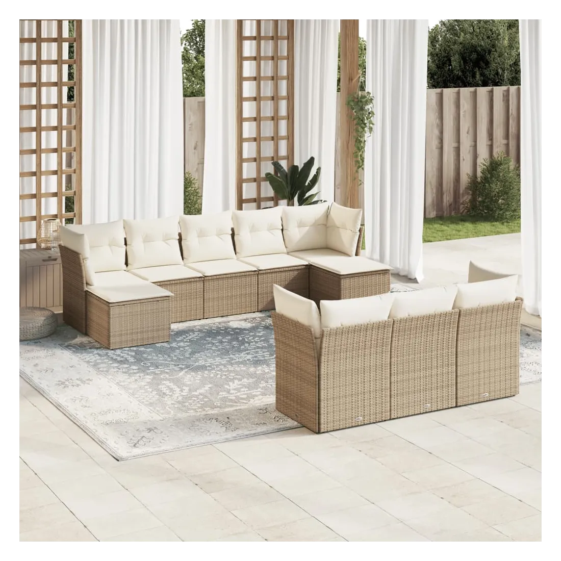 Cet ensemble de canapés de jardin est le complément parfait de votre arrière-cour, terrasse ou patio, offrant un espace confortable et accueillant pour discuter avec la famille et les amis ou simplement se détendre et profiter de l'extérieur. Matériau durable : la résine tressée, également connue sous le nom de poly rotin, est un matériau synthétique solide et nécessitant peu d'entretien qui ressemble au rotin naturel. Il est léger, facile à nettoyer et couramment utilisé pour les meubles d'extérieur en raison de sa durabilité et de ses propriétés de résistance aux intempéries.Expérience d'assise confortable : ce mobilier d'extérieur, doté de coussins épais, offre une expérience d'assise confortable.Housse amovible et lavable : ces coussins de siège sont dotés de housses amovibles pour un lavage et un entretien faciles.Conception modulaire : cet ensemble de meubles d'extérieur a une conception modulaire, ce qui le rend complètement flexible et facile à déplacer, afin que vous puissiez créer un agencement de meubles d'extérieur personnalisé. Bon à savoir :Pour que vos meubles d'extérieur restent beaux, nous vous recommandons de les protéger avec une housse imperméable.