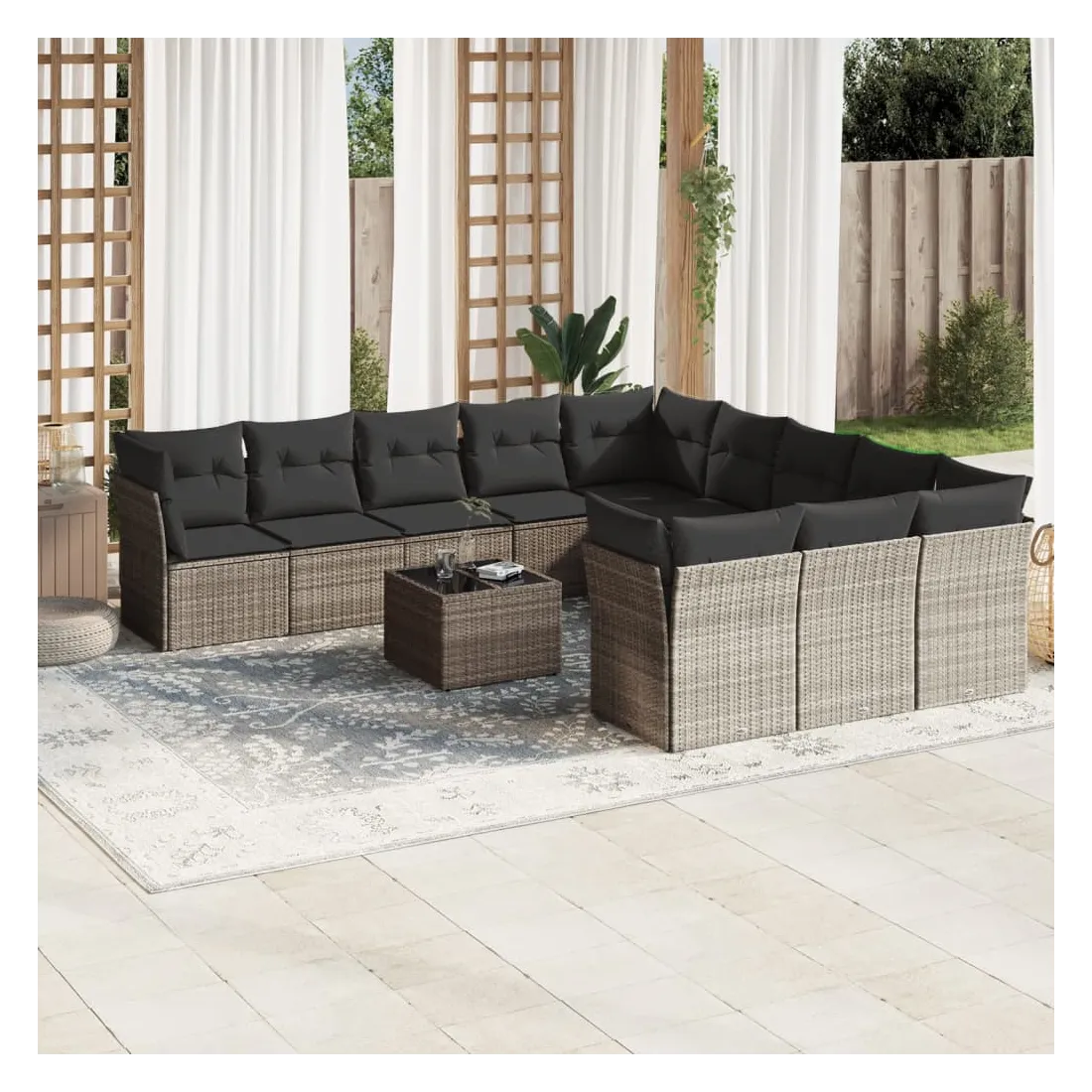 Cet ensemble de canapés de jardin est le complément parfait de votre arrière-cour, terrasse ou patio, offrant un espace confortable et accueillant pour discuter avec la famille et les amis ou simplement se détendre et profiter de l'extérieur. Matériau durable : la résine tressée, également connue sous le nom de poly rotin, est un matériau synthétique solide et nécessitant peu d'entretien qui ressemble au rotin naturel. Il est léger, facile à nettoyer et couramment utilisé pour les meubles d'extérieur en raison de sa durabilité et de ses propriétés de résistance aux intempéries.Expérience d'assise confortable : ce mobilier d'extérieur, doté de coussins épais, offre une expérience d'assise confortable.Dessus en verre : le dessus de la table d'extérieur est fabriqué en verre trempé solide et durable, ce qui le rend facile à nettoyer avec un chiffon humide et ajoute une touche d'élégance à votre espace extérieur.Housse amovible et lavable : ces coussins de siège sont dotés de housses amovibles pour un lavage et un entretien faciles.Conception modulaire : cet ensemble de meubles d'extérieur a une conception modulaire, ce qui le rend complètement flexible et facile à déplacer, afin que vous puissiez créer un agencement de meubles d'extérieur personnalisé. Bon à savoir :Pour que vos meubles d'extérieur restent beaux, nous vous recommandons de les protéger avec une housse imperméable.