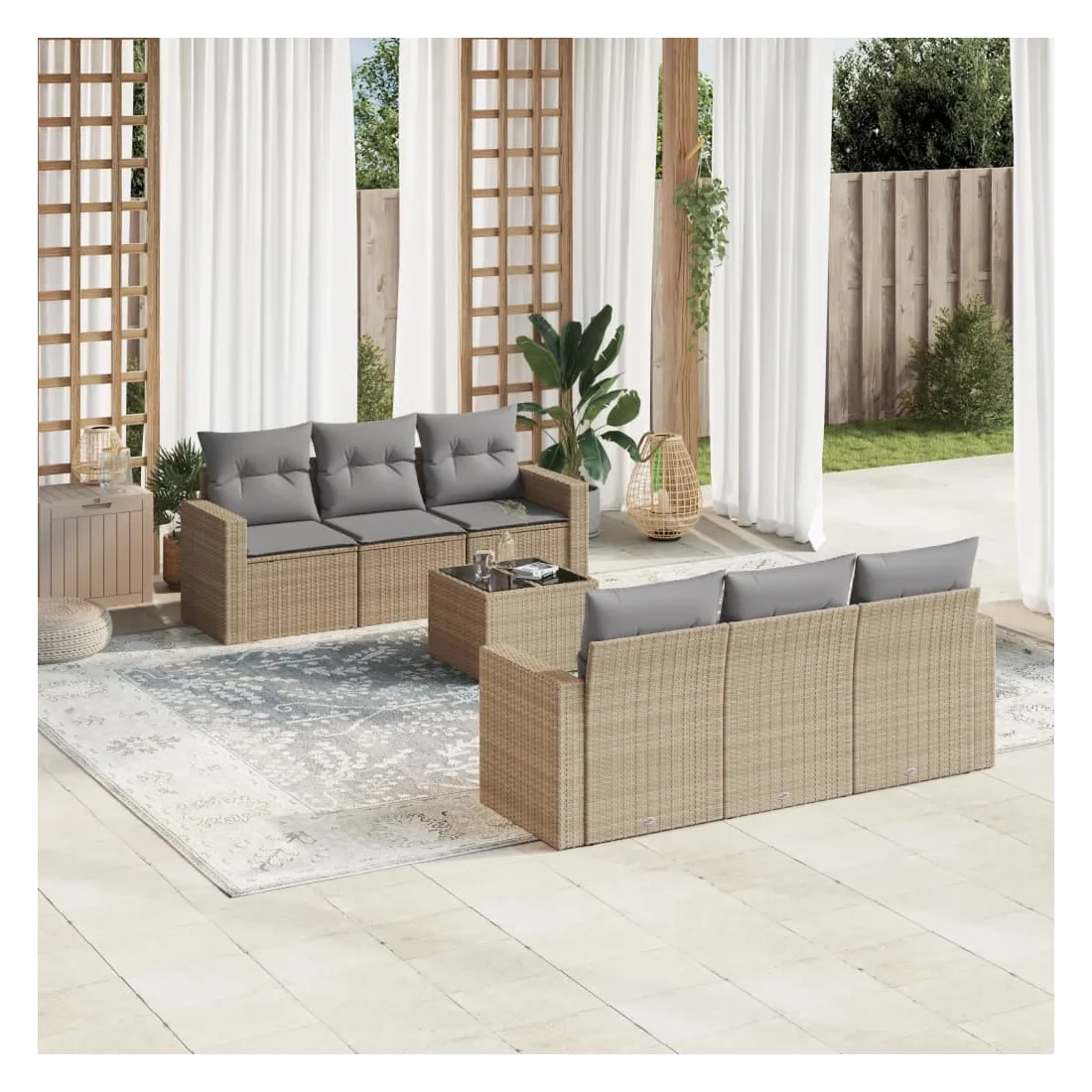 Cet ensemble de canapés de jardin est le complément parfait de votre arrière-cour, terrasse ou patio, offrant un espace confortable et accueillant pour discuter avec la famille et les amis ou simplement se détendre et profiter de l'extérieur. Matériau durable : la résine tressée, également connue sous le nom de poly rotin, est un matériau synthétique solide et nécessitant peu d'entretien qui ressemble au rotin naturel. Il est léger, facile à nettoyer et couramment utilisé pour les meubles d'extérieur en raison de sa durabilité et de ses propriétés de résistance aux intempéries.Expérience d'assise confortable : ce mobilier d'extérieur, doté de coussins épais, offre une expérience d'assise confortable. Les larges accoudoirs offrent également un endroit pratique pour garder votre téléphone portable, vos tasses ou d'autres petits objets à portée de main.Housse amovible et lavable : ces coussins de siège sont dotés de housses amovibles pour un lavage et un entretien faciles.Dessus en verre : le dessus de la table d'extérieur est fabriqué en verre trempé solide et durable, ce qui le rend facile à nettoyer avec un chiffon humide et ajoute une touche d'élégance à votre espace extérieur.Conception modulaire : cet ensemble de meubles d'extérieur a une conception modulaire, ce qui le rend complètement flexible et facile à déplacer, afin que vous puissiez créer un agencement de meubles d'extérieur personnalisé. Bon à savoir :Pour que vos meubles d'extérieur restent beaux, nous vous recommandons de les protéger avec une housse imperméable.