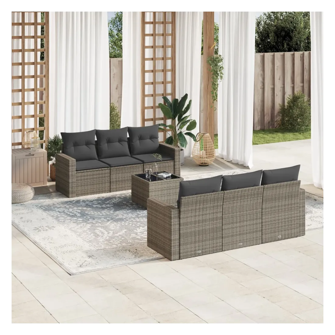 Cet ensemble de canapés de jardin est le complément parfait de votre arrière-cour, terrasse ou patio, offrant un espace confortable et accueillant pour discuter avec la famille et les amis ou simplement se détendre et profiter de l'extérieur. Matériau durable : la résine tressée, également connue sous le nom de poly rotin, est un matériau synthétique solide et nécessitant peu d'entretien qui ressemble au rotin naturel. Il est léger, facile à nettoyer et couramment utilisé pour les meubles d'extérieur en raison de sa durabilité et de ses propriétés de résistance aux intempéries.Expérience d'assise confortable : ce mobilier d'extérieur, doté de coussins épais, offre une expérience d'assise confortable. Les larges accoudoirs offrent également un endroit pratique pour garder votre téléphone portable, vos tasses ou d'autres petits objets à portée de main.Housse amovible et lavable : ces coussins de siège sont dotés de housses amovibles pour un lavage et un entretien faciles.Dessus en verre : le dessus de la table d'extérieur est fabriqué en verre trempé solide et durable, ce qui le rend facile à nettoyer avec un chiffon humide et ajoute une touche d'élégance à votre espace extérieur.Conception modulaire : cet ensemble de meubles d'extérieur a une conception modulaire, ce qui le rend complètement flexible et facile à déplacer, afin que vous puissiez créer un agencement de meubles d'extérieur personnalisé. Bon à savoir :Pour que vos meubles d'extérieur restent beaux, nous vous recommandons de les protéger avec une housse imperméable.