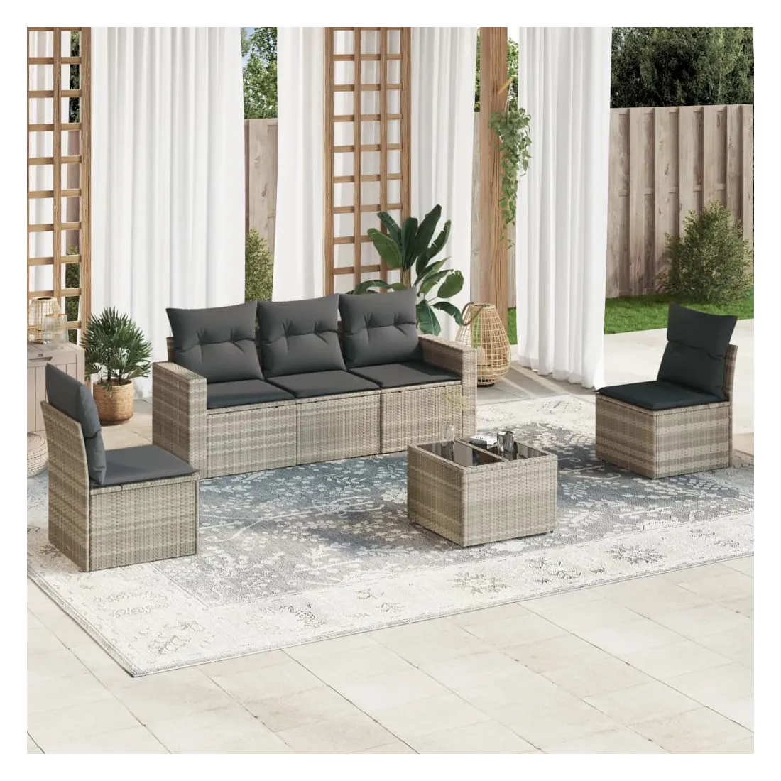Cet ensemble de canapés de jardin est le complément parfait de votre arrière-cour, terrasse ou patio, offrant un espace confortable et accueillant pour discuter avec la famille et les amis ou simplement se détendre et profiter de l'extérieur. Matériau durable : la résine tressée, également connue sous le nom de poly rotin, est un matériau synthétique solide et nécessitant peu d'entretien qui ressemble au rotin naturel. Il est léger, facile à nettoyer et couramment utilisé pour les meubles d'extérieur en raison de sa durabilité et de ses propriétés de résistance aux intempéries.Expérience d'assise confortable : ce mobilier d'extérieur, doté de coussins épais, offre une expérience d'assise confortable. Les larges accoudoirs offrent également un endroit pratique pour garder votre téléphone portable, vos tasses ou d'autres petits objets à portée de main.Housse amovible et lavable : ces coussins de siège sont dotés de housses amovibles pour un lavage et un entretien faciles.Dessus en verre : le dessus de la table d'extérieur est fabriqué en verre trempé solide et durable, ce qui le rend facile à nettoyer avec un chiffon humide et ajoute une touche d'élégance à votre espace extérieur.Conception modulaire : cet ensemble de meubles d'extérieur a une conception modulaire, ce qui le rend complètement flexible et facile à déplacer, afin que vous puissiez créer un agencement de meubles d'extérieur personnalisé. Bon à savoir :Pour que vos meubles d'extérieur restent beaux, nous vous recommandons de les protéger avec une housse imperméable.