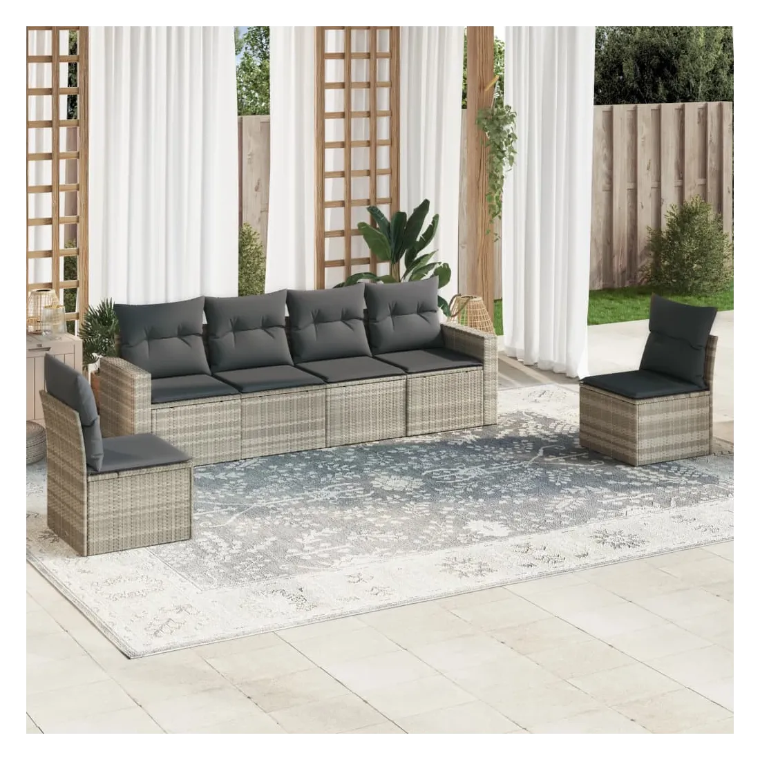 Cet ensemble de canapés de jardin est le complément parfait de votre arrière-cour, terrasse ou patio, offrant un espace confortable et accueillant pour discuter avec la famille et les amis ou simplement se détendre et profiter de l'extérieur. Matériau durable : la résine tressée, également connue sous le nom de poly rotin, est un matériau synthétique solide et nécessitant peu d'entretien qui ressemble au rotin naturel. Il est léger, facile à nettoyer et couramment utilisé pour les meubles d'extérieur en raison de sa durabilité et de ses propriétés de résistance aux intempéries.Expérience d'assise confortable : ce mobilier d'extérieur, doté de coussins épais, offre une expérience d'assise confortable. Les larges accoudoirs offrent également un endroit pratique pour garder votre téléphone portable, vos tasses ou d'autres petits objets à portée de main.Housse amovible et lavable : ces coussins de siège sont dotés de housses amovibles pour un lavage et un entretien faciles.Conception modulaire : cet ensemble de meubles d'extérieur a une conception modulaire, ce qui le rend complètement flexible et facile à déplacer, afin que vous puissiez créer un agencement de meubles d'extérieur personnalisé. Bon à savoir :Pour que vos meubles d'extérieur restent beaux, nous vous recommandons de les protéger avec une housse imperméable.