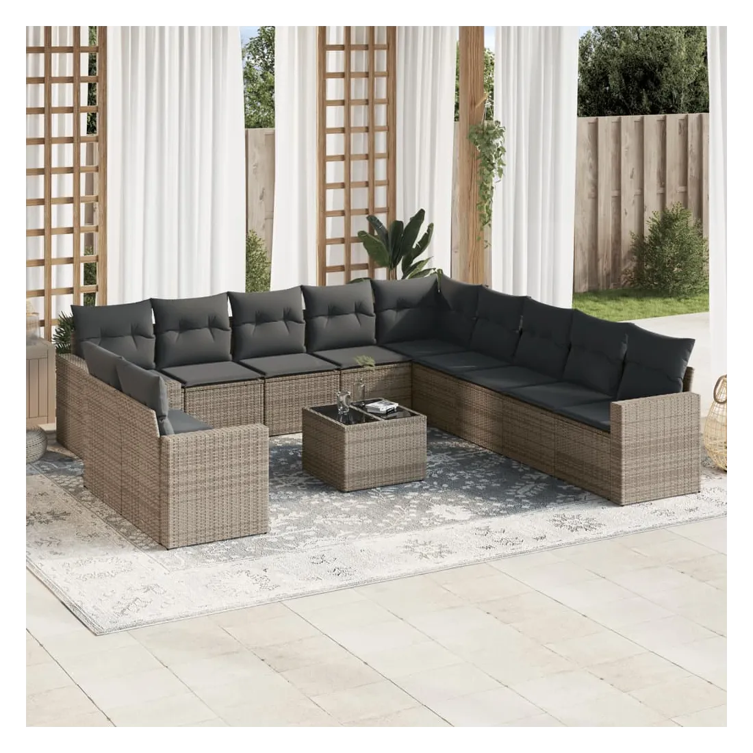 Cet ensemble de canapés de jardin est le complément parfait de votre arrière-cour, terrasse ou patio, offrant un espace confortable et accueillant pour discuter avec la famille et les amis ou simplement se détendre et profiter de l'extérieur. Matériau durable : la résine tressée, également connue sous le nom de poly rotin, est un matériau synthétique solide et nécessitant peu d'entretien qui ressemble au rotin naturel. Il est léger, facile à nettoyer et couramment utilisé pour les meubles d'extérieur en raison de sa durabilité et de ses propriétés de résistance aux intempéries.Expérience d'assise confortable : ce mobilier d'extérieur, doté de coussins épais, offre une expérience d'assise confortable. Les larges accoudoirs offrent également un endroit pratique pour garder votre téléphone portable, vos tasses ou d'autres petits objets à portée de main.Housse amovible et lavable : ces coussins de siège sont dotés de housses amovibles pour un lavage et un entretien faciles.Dessus en verre : le dessus de la table d'extérieur est fabriqué en verre trempé solide et durable, ce qui le rend facile à nettoyer avec un chiffon humide et ajoute une touche d'élégance à votre espace extérieur.Conception modulaire : cet ensemble de meubles d'extérieur a une conception modulaire, ce qui le rend complètement flexible et facile à déplacer, afin que vous puissiez créer un agencement de meubles d'extérieur personnalisé. Bon à savoir :Pour que vos meubles d'extérieur restent beaux, nous vous recommandons de les protéger avec une housse imperméable.