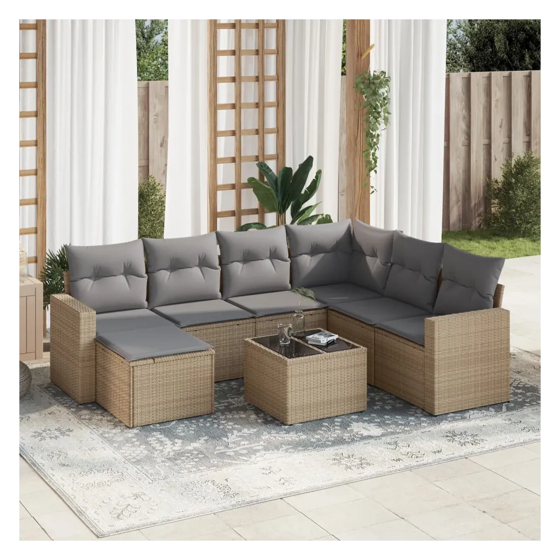 Cet ensemble de canapés de jardin est le complément parfait de votre arrière-cour, terrasse ou patio, offrant un espace confortable et accueillant pour discuter avec la famille et les amis ou simplement se détendre et profiter de l'extérieur. Matériau durable : la résine tressée, également connue sous le nom de poly rotin, est un matériau synthétique solide et nécessitant peu d'entretien qui ressemble au rotin naturel. Il est léger, facile à nettoyer et couramment utilisé pour les meubles d'extérieur en raison de sa durabilité et de ses propriétés de résistance aux intempéries.Expérience d'assise confortable : ce mobilier d'extérieur, doté de coussins épais, offre une expérience d'assise confortable. Les larges accoudoirs offrent également un endroit pratique pour garder votre téléphone portable, vos tasses ou d'autres petits objets à portée de main.Housse amovible et lavable : ces coussins de siège sont dotés de housses amovibles pour un lavage et un entretien faciles.Dessus en verre : le dessus de la table d'extérieur est fabriqué en verre trempé solide et durable, ce qui le rend facile à nettoyer avec un chiffon humide et ajoute une touche d'élégance à votre espace extérieur.Conception modulaire : cet ensemble de meubles d'extérieur a une conception modulaire, ce qui le rend complètement flexible et facile à déplacer, afin que vous puissiez créer un agencement de meubles d'extérieur personnalisé. Bon à savoir :Pour que vos meubles d'extérieur restent beaux, nous vous recommandons de les protéger avec une housse imperméable.