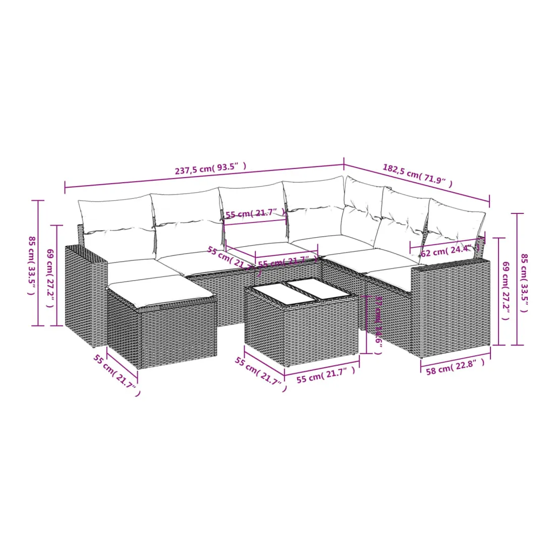 - Dimensions du coussin de siège : 55 x 55 x 3 cm (l x P x é)