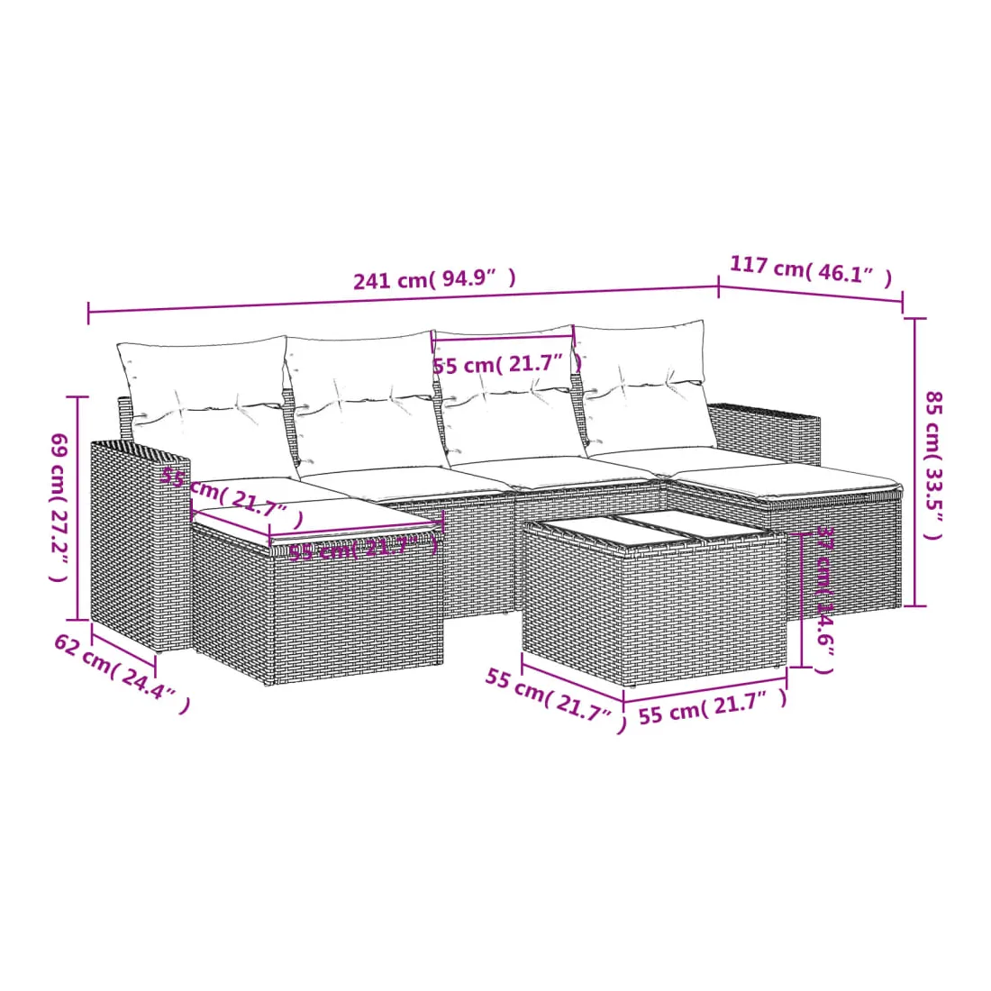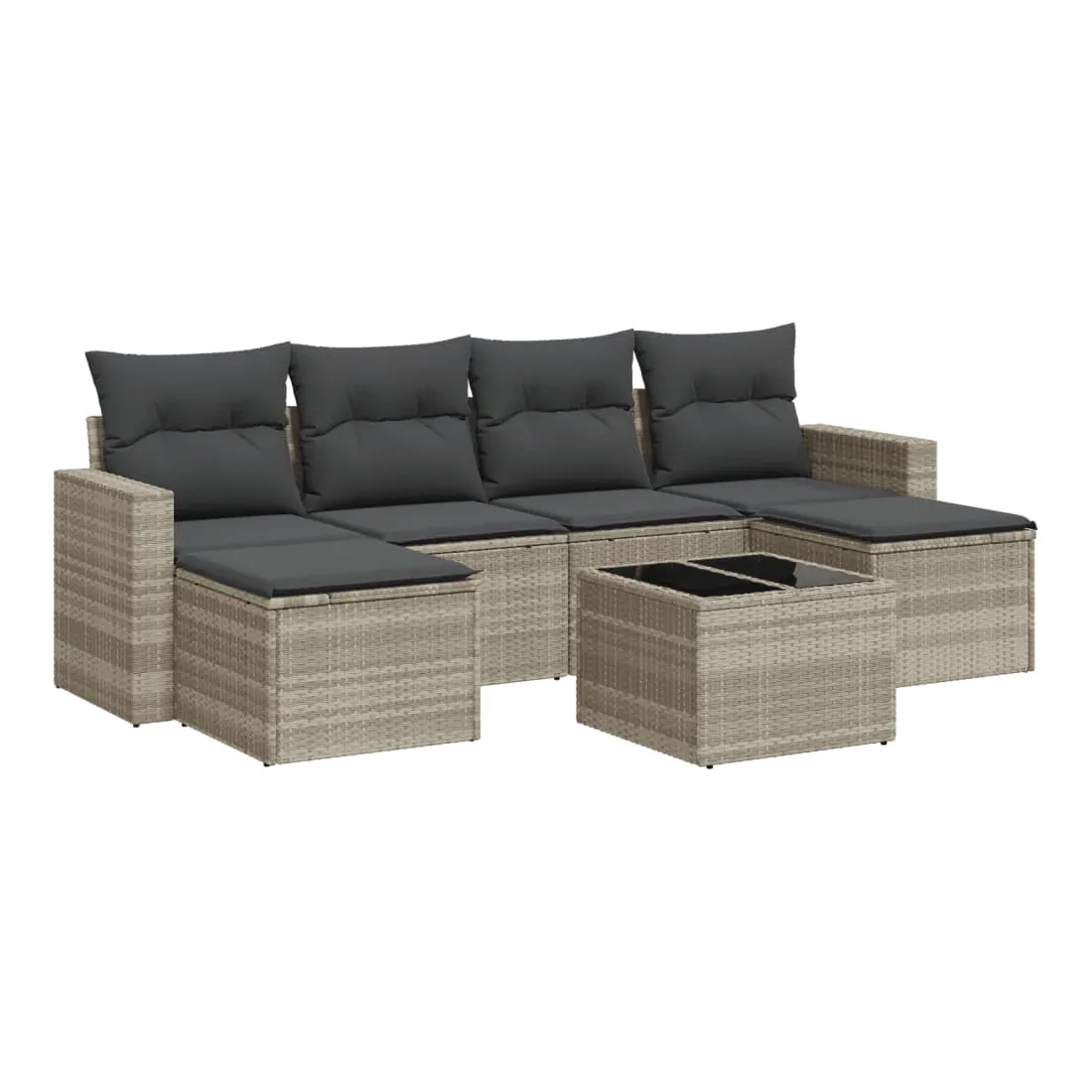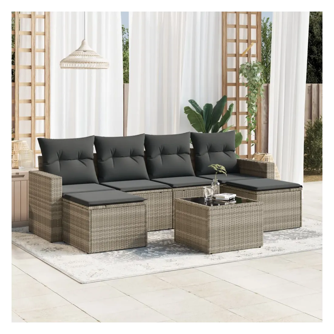 Cet ensemble de canapés de jardin est le complément parfait de votre arrière-cour, terrasse ou patio, offrant un espace confortable et accueillant pour discuter avec la famille et les amis ou simplement se détendre et profiter de l'extérieur. Matériau durable : la résine tressée, également connue sous le nom de poly rotin, est un matériau synthétique solide et nécessitant peu d'entretien qui ressemble au rotin naturel. Il est léger, facile à nettoyer et couramment utilisé pour les meubles d'extérieur en raison de sa durabilité et de ses propriétés de résistance aux intempéries.Expérience d'assise confortable : ce mobilier d'extérieur, doté de coussins épais, offre une expérience d'assise confortable. Les larges accoudoirs offrent également un endroit pratique pour garder votre téléphone portable, vos tasses ou d'autres petits objets à portée de main.Housse amovible et lavable : ces coussins de siège sont dotés de housses amovibles pour un lavage et un entretien faciles.Dessus en verre : le dessus de la table d'extérieur est fabriqué en verre trempé solide et durable, ce qui le rend facile à nettoyer avec un chiffon humide et ajoute une touche d'élégance à votre espace extérieur.Conception modulaire : cet ensemble de meubles d'extérieur a une conception modulaire, ce qui le rend complètement flexible et facile à déplacer, afin que vous puissiez créer un agencement de meubles d'extérieur personnalisé. Bon à savoir :Pour que vos meubles d'extérieur restent beaux, nous vous recommandons de les protéger avec une housse imperméable.