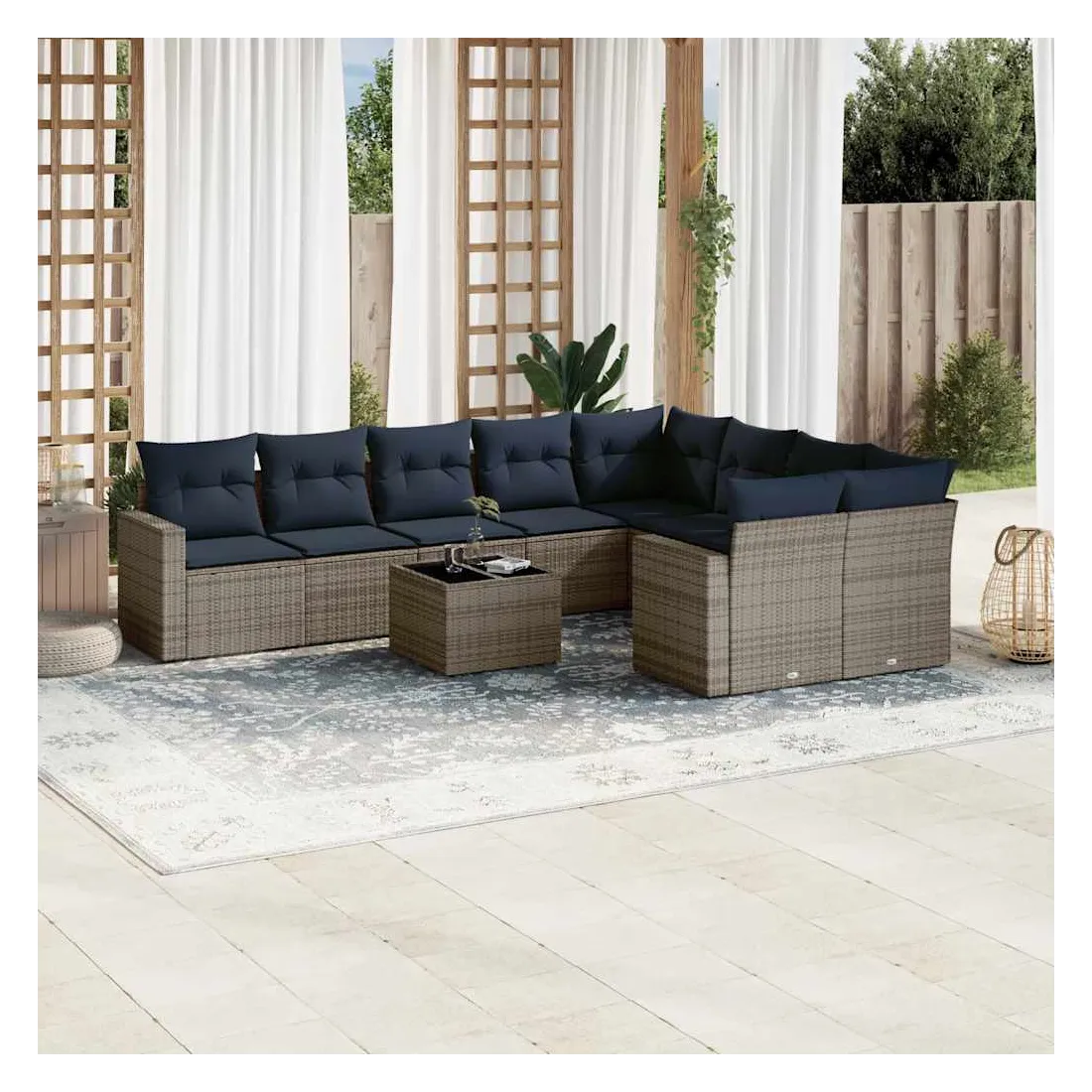 Cet ensemble de canapés de jardin est le complément parfait de votre arrière-cour, terrasse ou patio, offrant un espace confortable et accueillant pour discuter avec la famille et les amis ou simplement se détendre et profiter de l'extérieur. Matériau durable : la résine tressée, également connue sous le nom de poly rotin, est un matériau synthétique solide et nécessitant peu d'entretien qui ressemble au rotin naturel. Il est léger, facile à nettoyer et couramment utilisé pour les meubles d'extérieur en raison de sa durabilité et de ses propriétés de résistance aux intempéries.Expérience d'assise confortable : ce mobilier d'extérieur, doté de coussins épais, offre une expérience d'assise confortable.Housse amovible et lavable : ces coussins de siège sont dotés de housses amovibles pour un lavage et un entretien faciles.Dessus en verre : le dessus de la table d'extérieur est fabriqué en verre trempé solide et durable, ce qui le rend facile à nettoyer avec un chiffon humide et ajoute une touche d'élégance à votre espace extérieur.Conception modulaire : cet ensemble de meubles d'extérieur a une conception modulaire, ce qui le rend complètement flexible et facile à déplacer, afin que vous puissiez créer un agencement de meubles d'extérieur personnalisé. Bon à savoir :Pour que vos meubles d'extérieur restent beaux, nous vous recommandons de les protéger avec une housse imperméable.