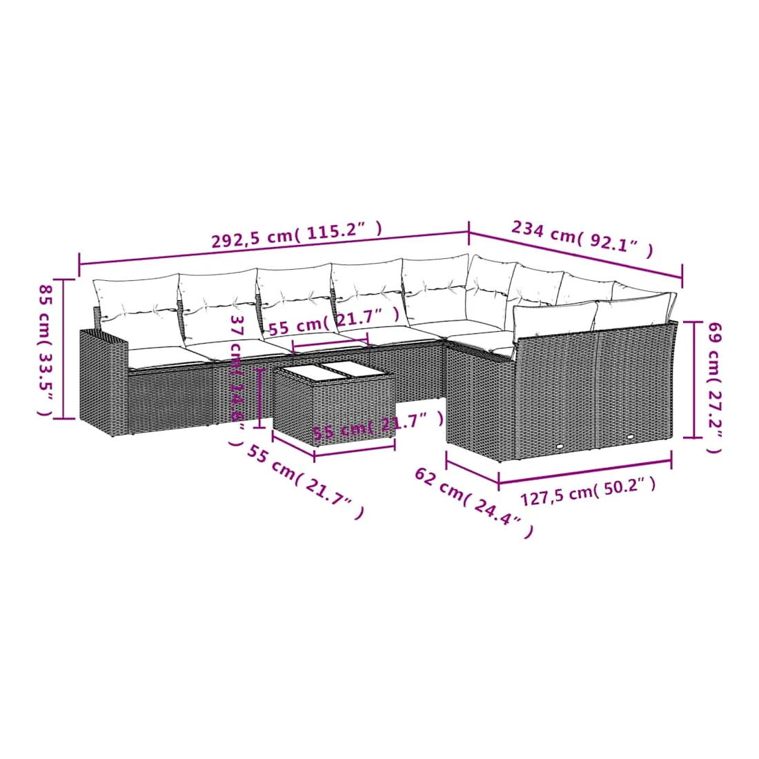 - 9 x coussin d'assise avec housse amovible et lavable
