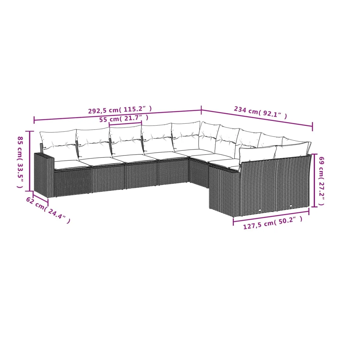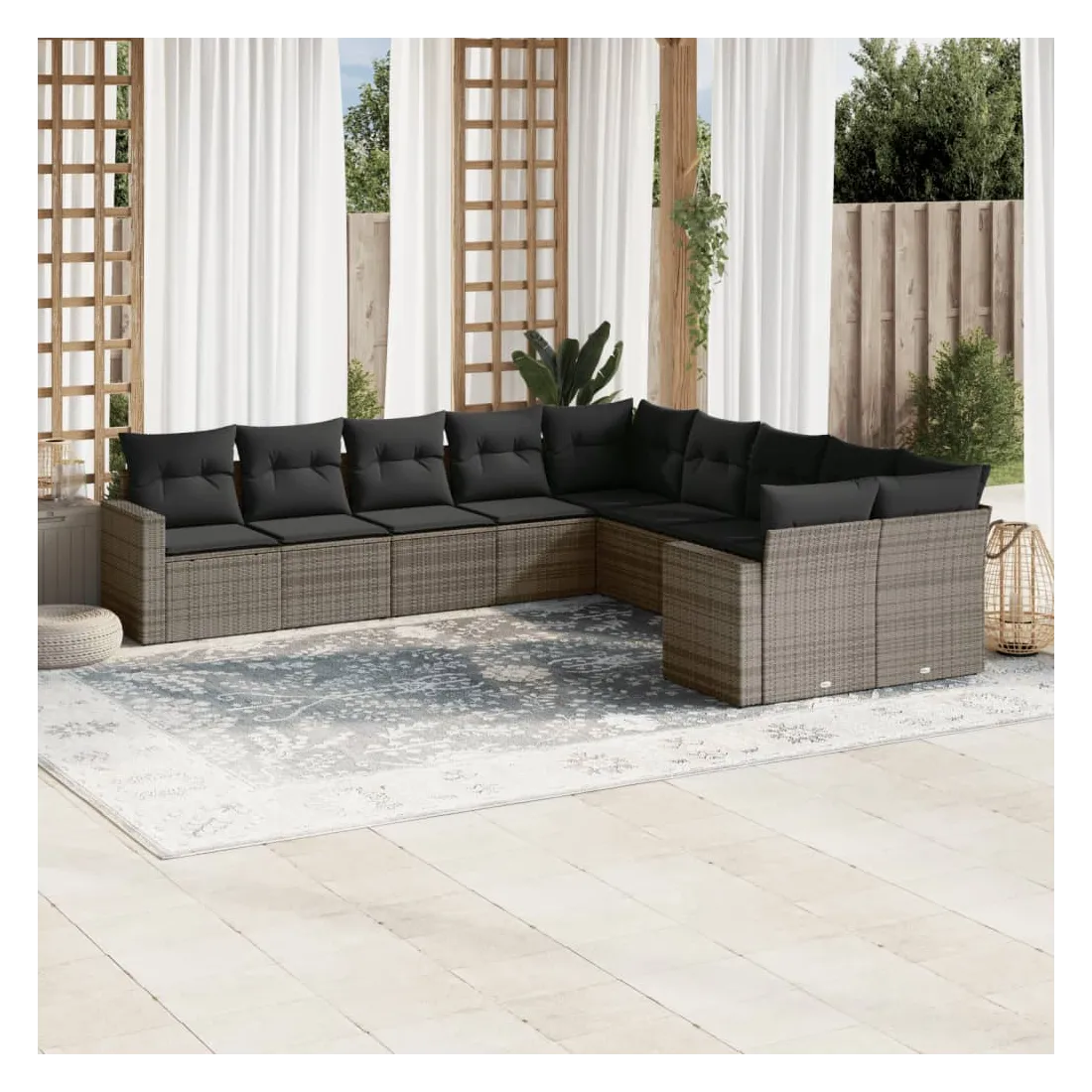 Cet ensemble de canapés de jardin est le complément parfait de votre arrière-cour, terrasse ou patio, offrant un espace confortable et accueillant pour discuter avec la famille et les amis ou simplement se détendre et profiter de l'extérieur. Matériau durable : la résine tressée, également connue sous le nom de poly rotin, est un matériau synthétique solide et nécessitant peu d'entretien qui ressemble au rotin naturel. Il est léger, facile à nettoyer et couramment utilisé pour les meubles d'extérieur en raison de sa durabilité et de ses propriétés de résistance aux intempéries.Expérience d'assise confortable : ce mobilier d'extérieur, doté de coussins épais, offre une expérience d'assise confortable.Housse amovible et lavable : ces coussins de siège sont dotés de housses amovibles pour un lavage et un entretien faciles.Conception modulaire : cet ensemble de meubles d'extérieur a une conception modulaire, ce qui le rend complètement flexible et facile à déplacer, afin que vous puissiez créer un agencement de meubles d'extérieur personnalisé. Bon à savoir :Pour que vos meubles d'extérieur restent beaux, nous vous recommandons de les protéger avec une housse imperméable.