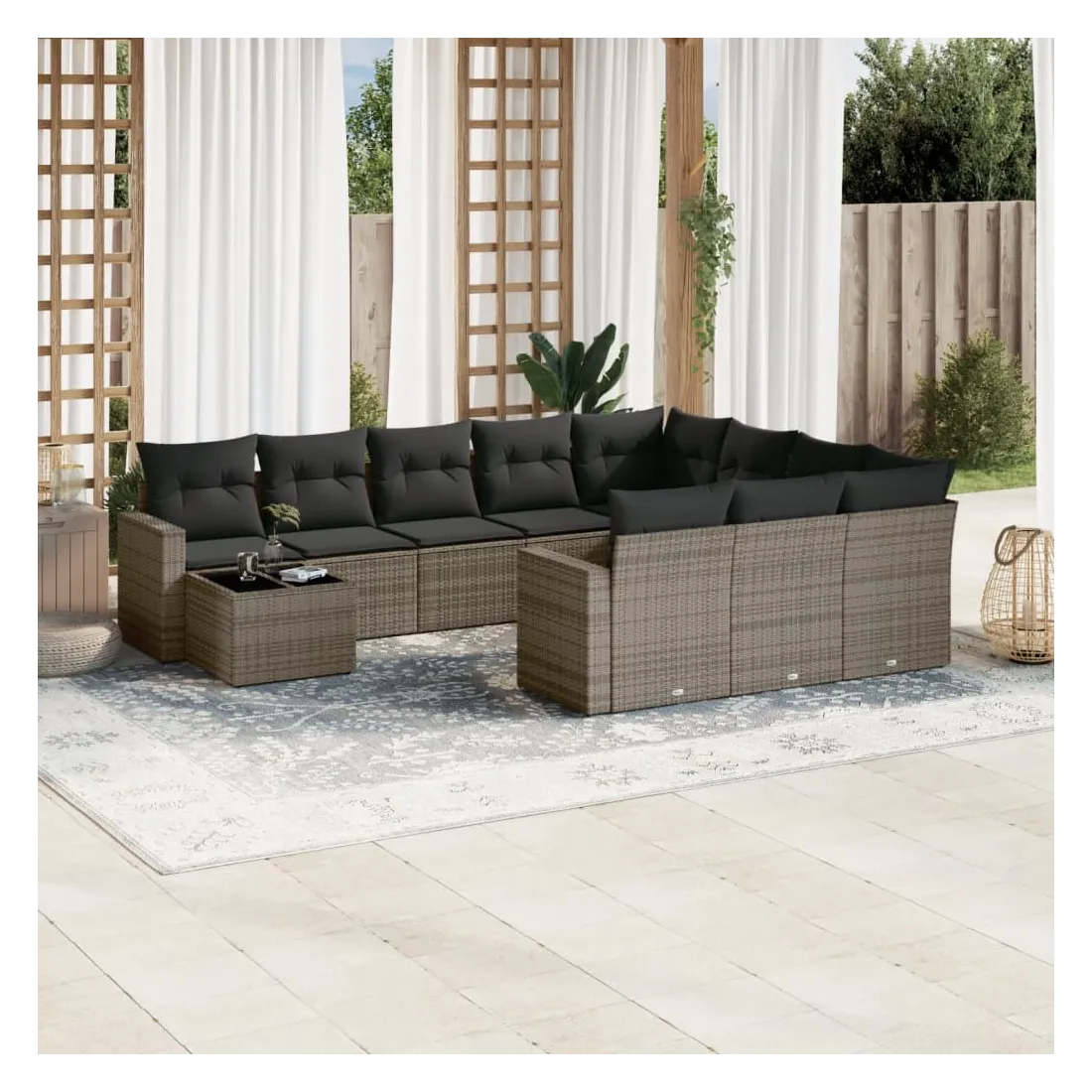 Cet ensemble de canapés de jardin est le complément parfait de votre arrière-cour, terrasse ou patio, offrant un espace confortable et accueillant pour discuter avec la famille et les amis ou simplement se détendre et profiter de l'extérieur. Matériau durable : la résine tressée, également connue sous le nom de poly rotin, est un matériau synthétique solide et nécessitant peu d'entretien qui ressemble au rotin naturel. Il est léger, facile à nettoyer et couramment utilisé pour les meubles d'extérieur en raison de sa durabilité et de ses propriétés de résistance aux intempéries.Dessus en verre : le dessus de la table d'extérieur est fabriqué en verre trempé solide et durable, ce qui le rend facile à nettoyer avec un chiffon humide et ajoute une touche d'élégance à votre espace extérieur. Expérience d'assise confortable : ce mobilier d'extérieur, doté de coussins épais, offre une expérience d'assise confortable. Housse amovible et lavable : ces coussins de siège sont dotés de housses amovibles pour un lavage et un entretien faciles.Conception modulaire : cet ensemble de meubles d'extérieur a une conception modulaire, ce qui le rend complètement flexible et facile à déplacer, afin que vous puissiez créer un agencement de meubles d'extérieur personnalisé. Bon à savoir :Pour que vos meubles d'extérieur restent beaux, nous vous recommandons de les protéger avec une housse imperméable.