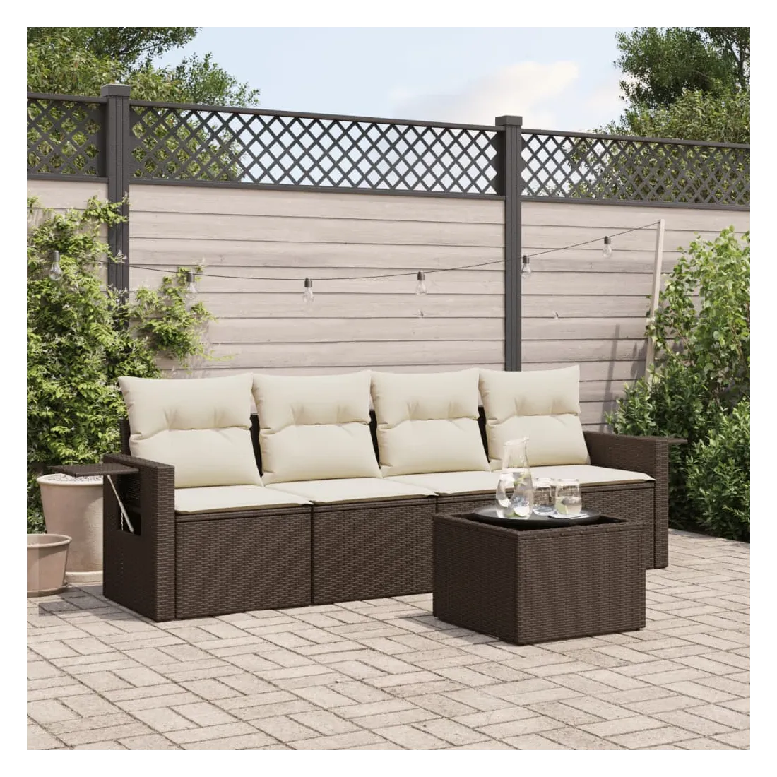 Cet ensemble de canapés de jardin est le complément parfait de votre arrière-cour, terrasse ou patio, offrant un espace confortable et accueillant pour discuter avec la famille et les amis ou simplement se détendre et profiter de l'extérieur. Matériau durable : la résine tressée, également connue sous le nom de poly rotin, est un matériau synthétique solide et nécessitant peu d'entretien qui ressemble au rotin naturel. Il est léger, facile à nettoyer et couramment utilisé pour les meubles d'extérieur en raison de sa durabilité et de ses propriétés de résistance aux intempéries.Dessus en verre : le dessus de la table d'extérieur est fabriqué en verre trempé solide et durable, ce qui le rend facile à nettoyer avec un chiffon humide et ajoute une touche d'élégance à votre espace extérieur. Table d'appoint pratique : ce mobilier d'extérieur comprend des tables d'appoint pliables avec un ressort à gaz sur les accoudoirs, offrant des endroits pratiques pour garder vos essentiels à portée de main. Expérience d'assise confortable : ce mobilier d'extérieur, doté de coussins épais, offre une expérience d'assise confortable.Conception modulaire : cet ensemble de meubles d'extérieur a une conception modulaire, ce qui le rend complètement flexible et facile à déplacer, afin que vous puissiez créer un agencement de meubles d'extérieur personnalisé. Bon à savoir :Pour que vos meubles d'extérieur restent beaux, nous vous recommandons de les protéger avec une housse imperméable.
