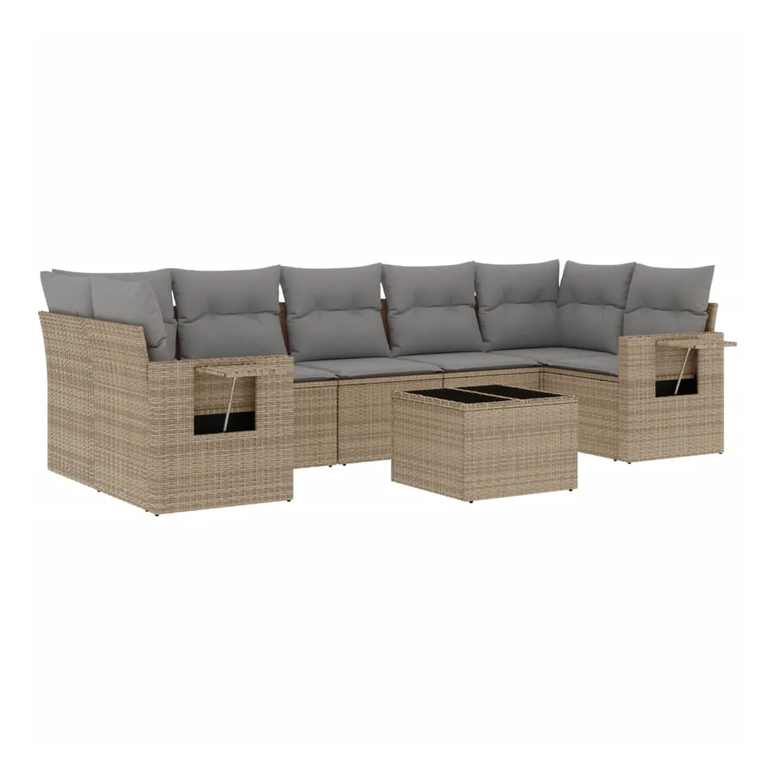 Cet ensemble de canapés de jardin est le complément parfait de votre arrière-cour, terrasse ou patio, offrant un espace confortable et accueillant pour discuter avec la famille et les amis ou simplement se détendre et profiter de l'extérieur. Matériau durable : la résine tressée, également connue sous le nom de poly rotin, est un matériau synthétique solide et nécessitant peu d'entretien qui ressemble au rotin naturel. Il est léger, facile à nettoyer et couramment utilisé pour les meubles d'extérieur en raison de sa durabilité et de ses propriétés de résistance aux intempéries.Dessus en verre : le dessus de la table d'extérieur est fabriqué en verre trempé solide et durable, ce qui le rend facile à nettoyer avec un chiffon humide et ajoute une touche d'élégance à votre espace extérieur. Table d'appoint pratique : ce mobilier d'extérieur comprend des tables d'appoint pliables avec un ressort à gaz sur les accoudoirs, offrant des endroits pratiques pour garder vos essentiels à portée de main. Expérience d'assise confortable : ce mobilier d'extérieur, doté de coussins épais, offre une expérience d'assise confortable.Conception modulaire : cet ensemble de meubles d'extérieur a une conception modulaire, ce qui le rend complètement flexible et facile à déplacer, afin que vous puissiez créer un agencement de meubles d'extérieur personnalisé. Bon à savoir :Pour que vos meubles d'extérieur restent beaux, nous vous recommandons de les protéger avec une housse imperméable.